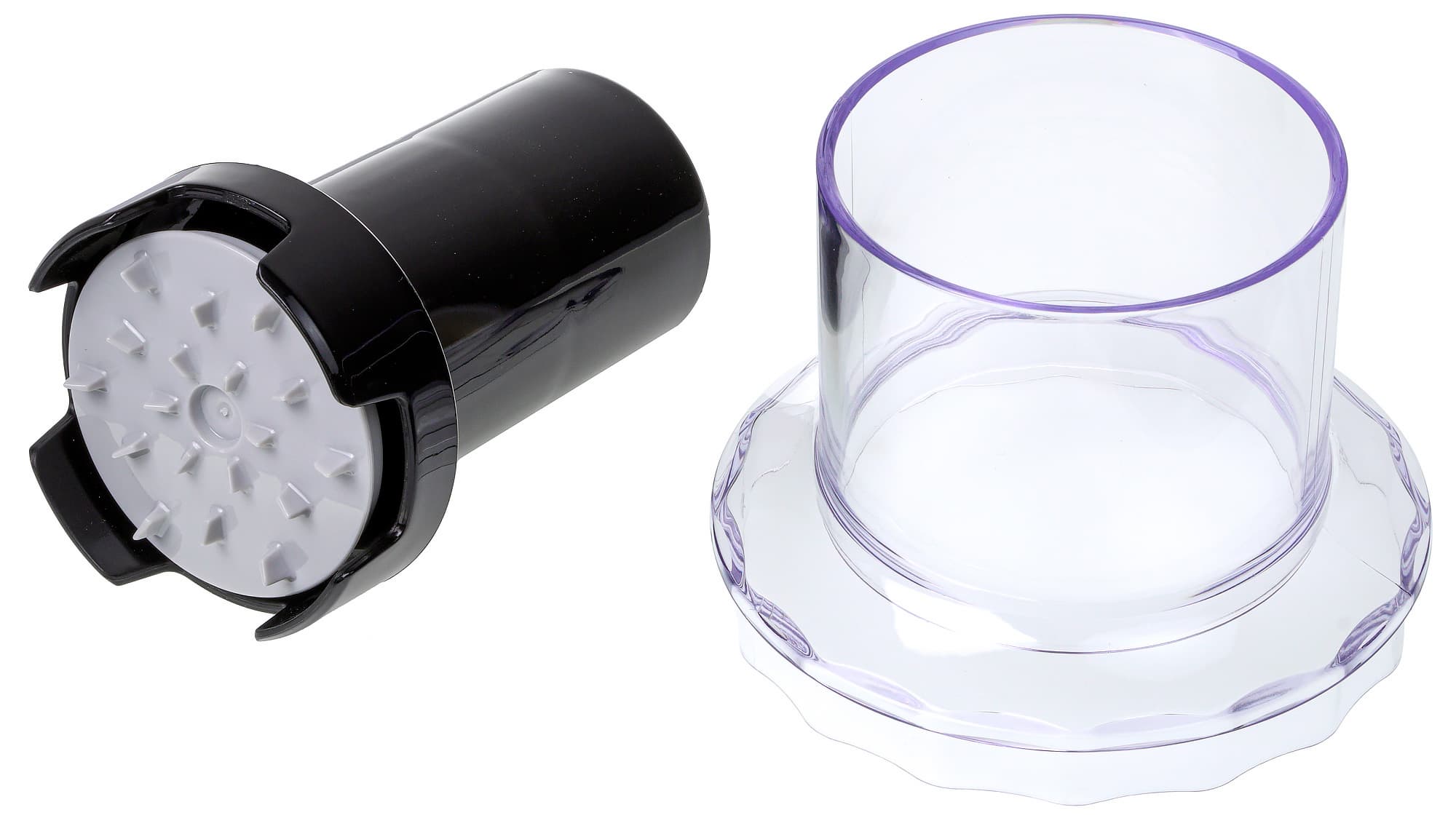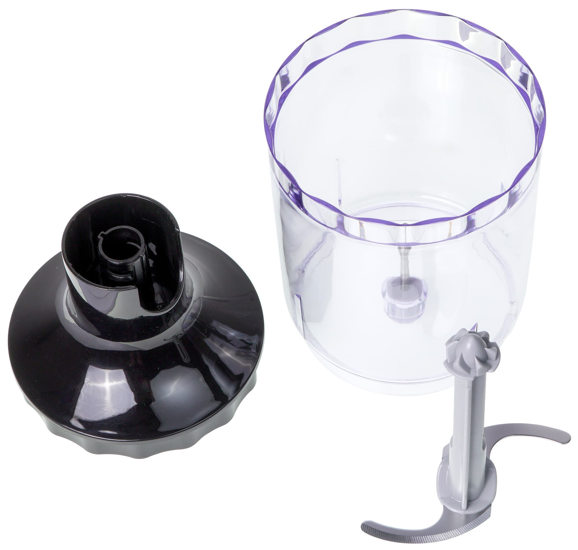 Объем чаши измельчителя — 1 литр, что в два раза больше, чем обычно в подобных наборах. Диаметр у нее стандартный, вместительность обеспечивается высотой. В центре дна чаши — металлический штырь, на который насаживается нож. Два острых серповидных лезвия расположены параллельно в 1 см друг от друга. С моторным блоком нож соединяется с помощью черной крышки-редуктора.