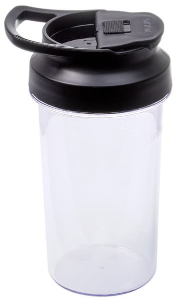 Стакан для измельчения снабжен крышкой с защелкой, предотвращающей протекание, — приготовленный смузи можно взять с собой прямо в нем. Производитель на всякий случай советует использовать в стакан только в вертикальном положении, но мы не удержались и сразу провели тест: налили воды, защелкнули клапан и перевернули емкость вверх дном — не протекло ни капли, так что можно не опасаться за содержимое сумки, в которую вы положите свой напиток. На стакане есть разметка: миллилитры, жидкие унции и чашки.