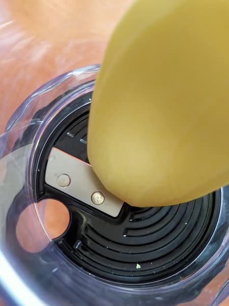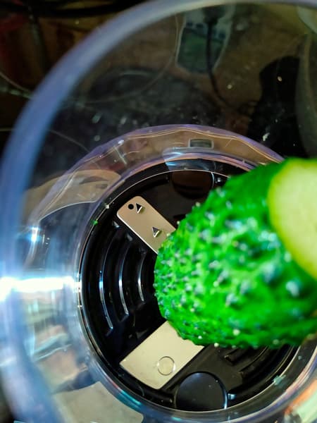 Чаша измельчителя хоть и ХL, но все равно количество закладываемых в нее продуктов ограничено 200 граммами. Если у вас больше «материала», придется совершить несколько подходов во избежание перегрузки мотора. Но она также является емкостью для спиралайзера, и тут объем себя оправдал: два небольших цукини в ней поместились без проблем, и нам не пришлось прерываться, чтобы освободить место.