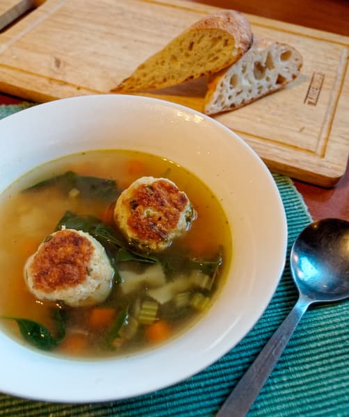 Поджаренные фрикадельки отложили, в той же сковороде обжарили морковь, стебель сельдерея и лук, порезанные кубиками. Забросили к ним две измельченные дольки чеснока. Когда овощи спассеровались, переложили их в кастрюлю, залили куриным бульоном, чуть погодя отправили в кастрюлю фрикадельки и мелкую пасту. Через 5 минут в суп отправились мангольд, шпинат, тертый пармезан, немного лимонного сока. Попробовали — выправили на соль и перец. Готово!