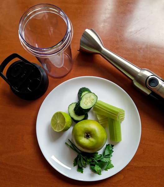 Этот тест так и напрашивался, ведь емкость для смешивания — еще и дорожный стакан, к нему и крышка специальная прилагается. Значит, надо сделать какой-нибудь коктейль, который можно захватить с собой. Дело было утром, хотелось чего-то свежего и бодрящего, так что взяли зеленое яблоко, огурец, стебель сельдерея, петрушку и немного лайма.