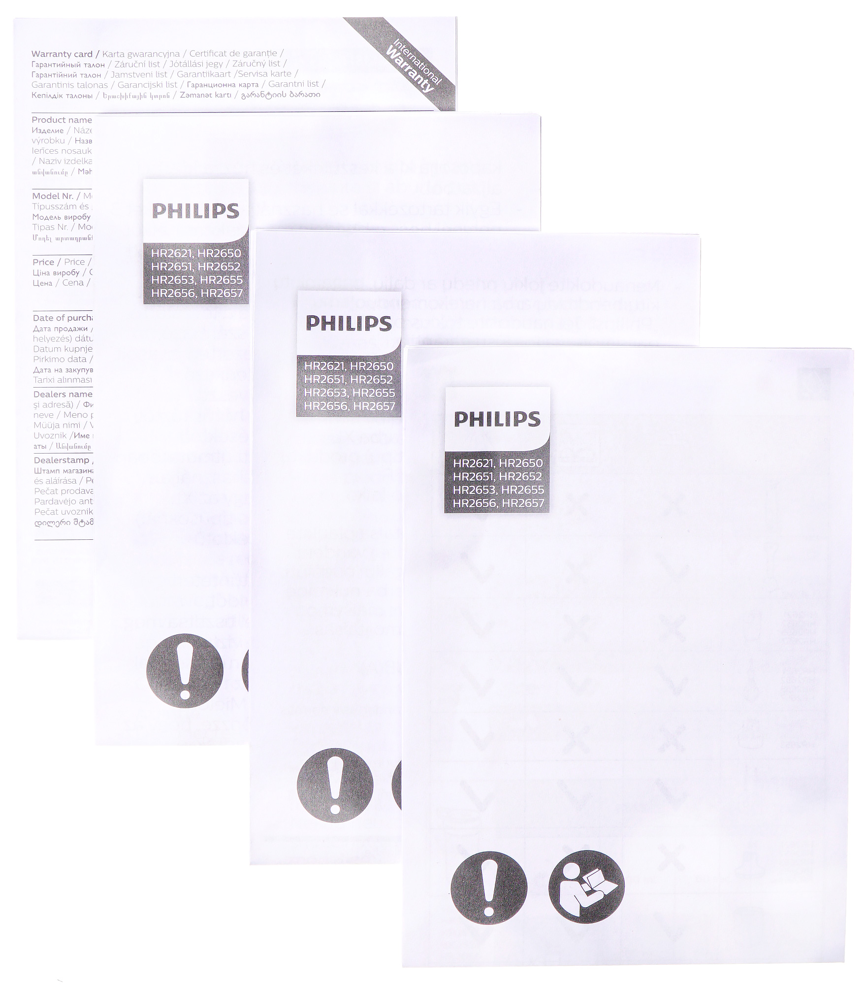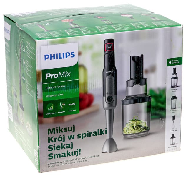 HR2657/90 прибыл к нам в яркой коробке без ручки. На упаковке мы видим изображения блендера и аксессуаров, фото иллюстрируют назначение каждого. На трех языках (польский, русский и украинский) можно ознакомиться с основными характеристиками устройства.