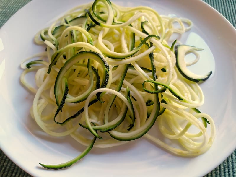 Цукини нарезался быстро, каждое «поленце» полностью переходило в чашу в пределах 7 секунд. Получили ворох длинных полосок, действительно похожих на классические спагетти, только раза в три длиннее. Среди полосок попадались полумесяцы, срезанные с краев.