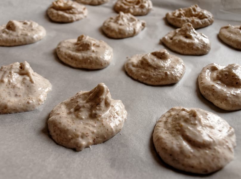 Итак, белки готовы. Мы взяли молотые миндаль и грецкие орехи (общим весом около 100 граммов), смешали их с кукурузным крахмалом, а затем аккуратно ввели в белки. Тесто выкладывали на выстеленный пергаментом противень столовой ложкой, чуть вытягивая верхушки для задорности. Все это дело отправилось в разогретую до 150 градусов духовку на 25 минут.