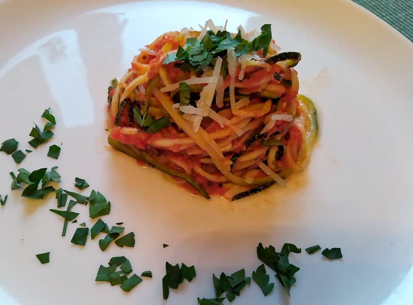 Посыпали готовое блюдо петрушкой и, нарушив веганскую идиллию, пармезаном. Конечно, от спагетти здесь только название и форма, и все же блюдо получилось очень вкусным, легким и текстурным — мы специально лишь немного прогрели цукини, чтобы они похрустывали. Замечательный вариант для легкого ужина или овощного гарнира и способ наконец накормить овощами детей, которые часто любому дефлопе предпочитают «макарошки».