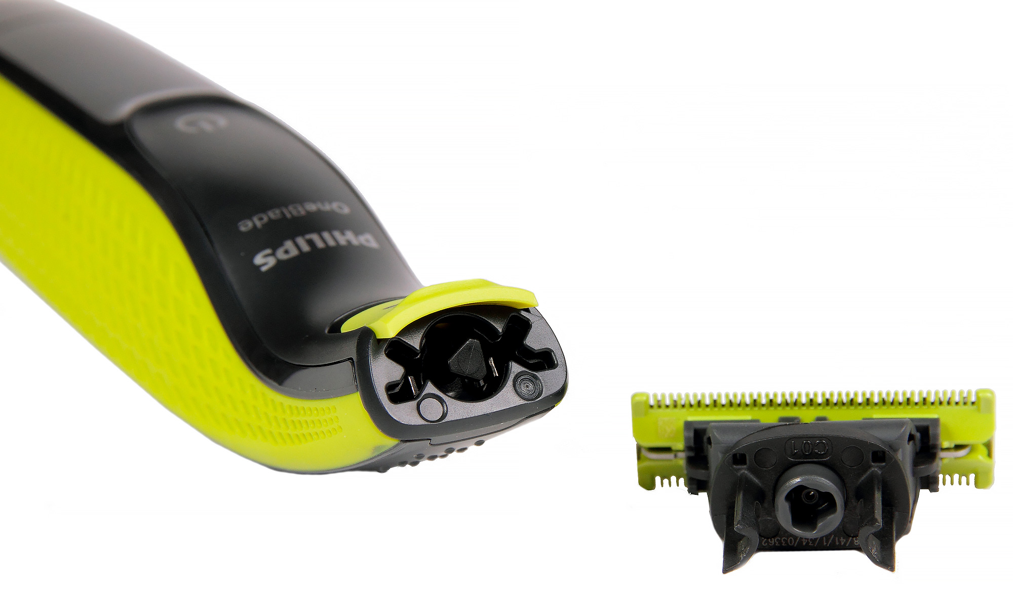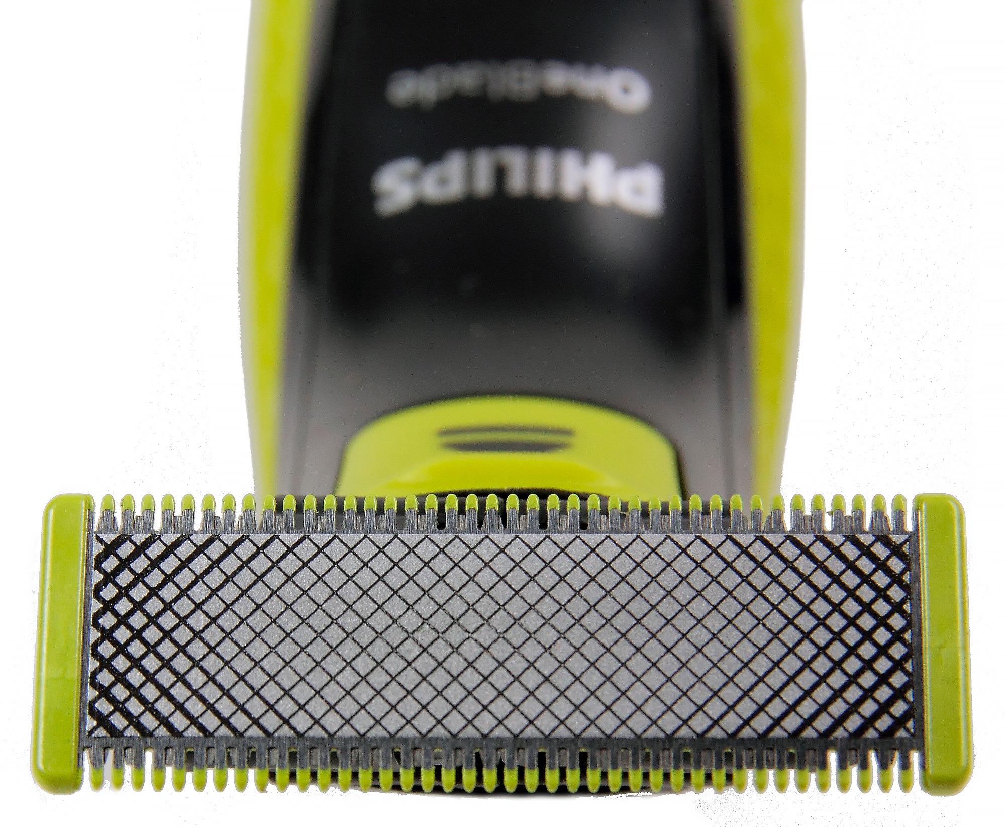 Сначала мы думали, что «сеточка» — это тоже активная, бреющая составляющая. Но нет — это просто гладкая пластиковая поверхность с сетчатым рисунком. Таким образом, бреет OneBlade только двумя краями, на которых установлены ножи триммерного типа.