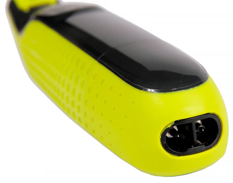 Разъем для адаптера питания находится сзади. Включать можно только устройство с отсоединенным адаптером питания, при попытке включить OneBlade в процессе зарядки просто ничего не произойдет.