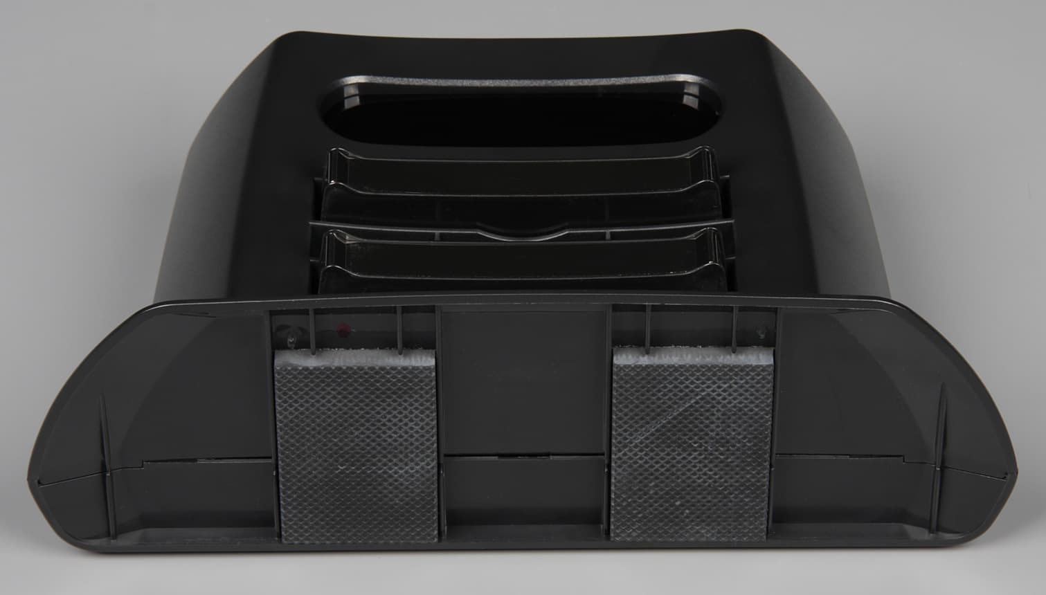 Переход углом от верхней панели к боковой поверхности снижает вероятность того, что пылесос будет застревать под препятствиями с небольшим просветом. Корпус робота и базы в основном изготовлены из практичного немаркого черного пластика с матовой поверхностью. Центральную часть верхней панели занимает крышка пылесборника. Она двухслойная — сверху слой прозрачного пластика, который прикрывает нижний слой пластика ярко-медного (как пишет производитель) оттенка.