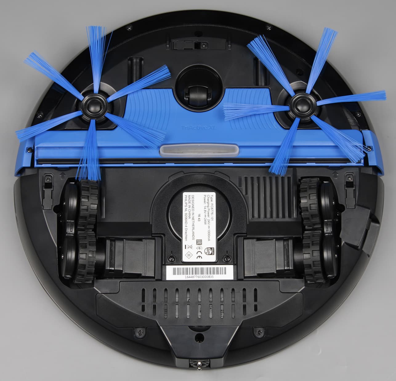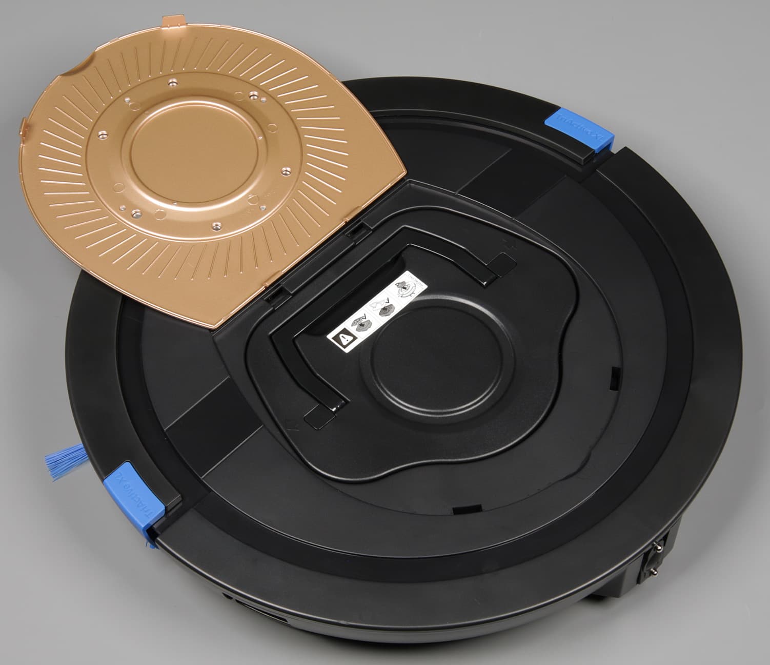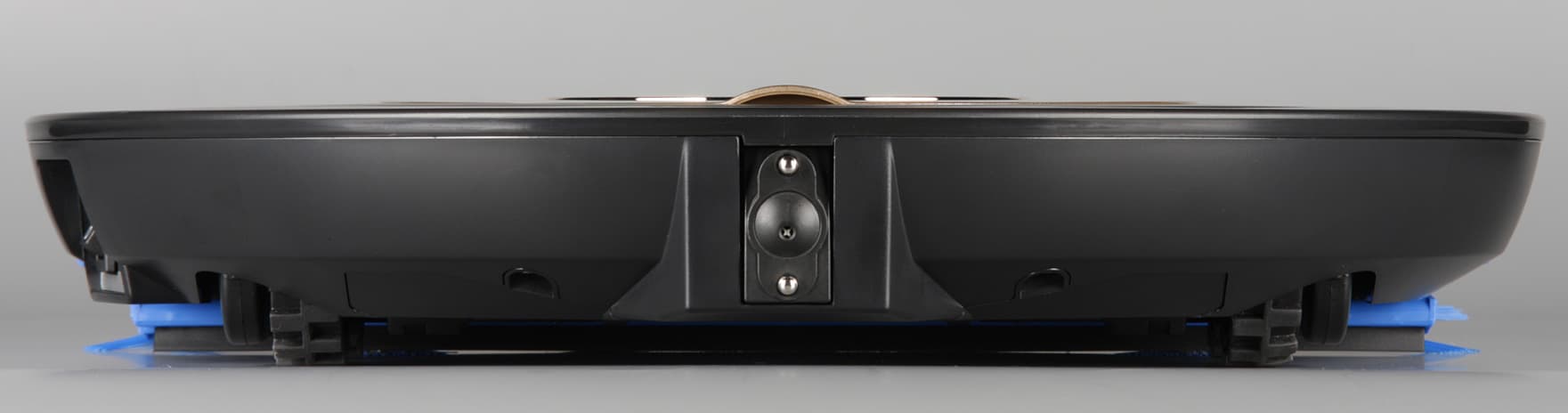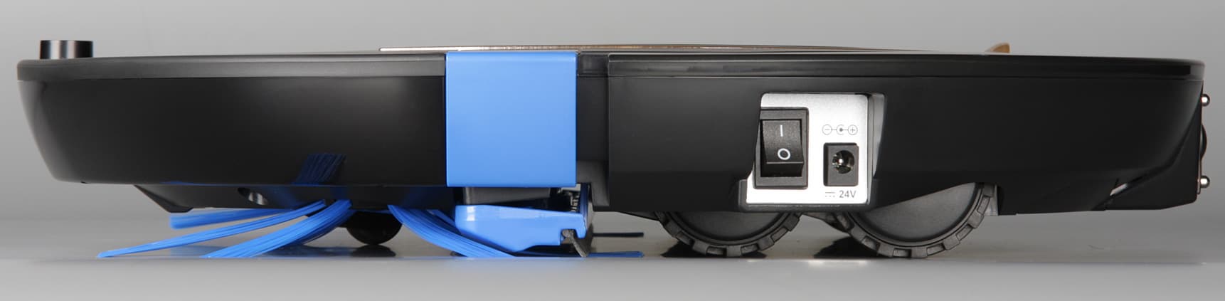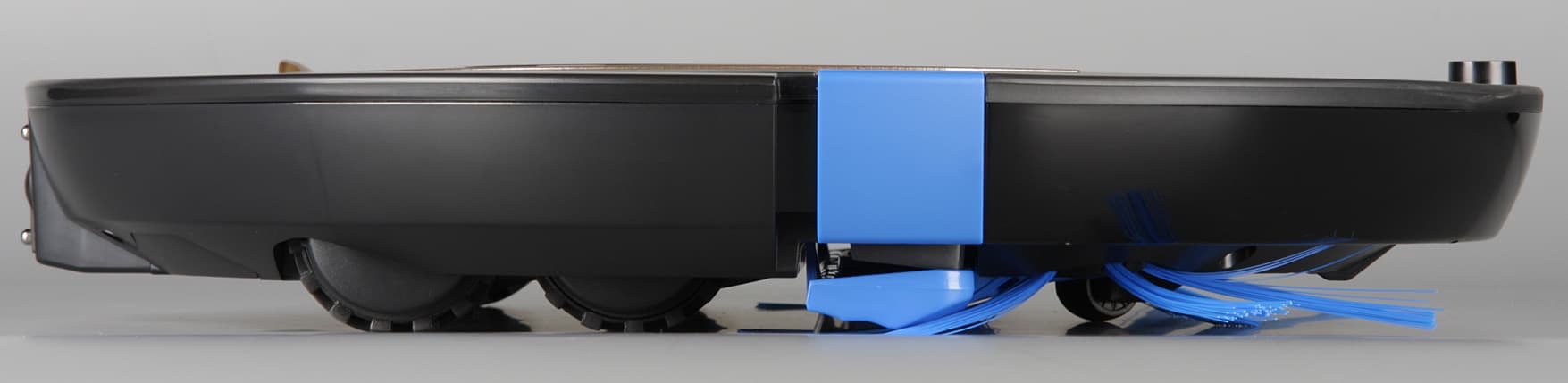 Перевернув пылесос вверх днищем, мы увидим передний опорный поворотный ролик, боковые щетки, синюю насадку с желобком-воздуховодом и резиновым скребком почти на всю ширину робота, всасывающий патрубок, четыре ведущих колеса на подпружиненных рычагах, выхлопную решетку и крышку отсека аккумулятора. Уборочная насадка широкая и поэтому позволяет за один проход убирать полосой шириной в 30 см, она подвижная, поэтому тщательно прилегает к полу, не наматывает волосы или шерсть и не требует частой очистки. В передней части и по бокам близко к краю расположены три ИК-датчика перепада высоты, благодаря которым пылесос может избежать падения со ступенек.