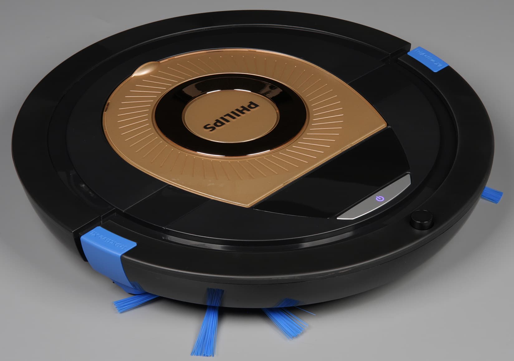 Ближе к передней части корпуса находится вставка из полупрозрачного тонированного пластика с зеркально-гладкой поверхностью, за которой расположены два значка состояния (ошибки и заполнения пылесборника), подсвечиваемые светодиодами. А сразу позади бампера есть единственная механическая кнопка с подсвечивающимся синим значком питания. Всю переднюю половину корпуса огибает подпружиненный бампер с небольшим ходом. Цилиндрический выступ сверху на бампере является самой высокой частью пылесоса и, соответственно, определяет минимальный просвет препятствия (например, дивана), под которое пылесос еще может забраться. Согласно нашим измерениям этот просвет равен 61 мм (приведем и полученное значение диаметра робота — 350 мм). Этот выступ является частью кругового датчика поиска базы и, возможно, приемника сигналов с пульта ДУ. Нижняя часть бампера изготовлена из прозрачного плотно тонированного пластика, который прикрывает ИК-датчики препятствий.