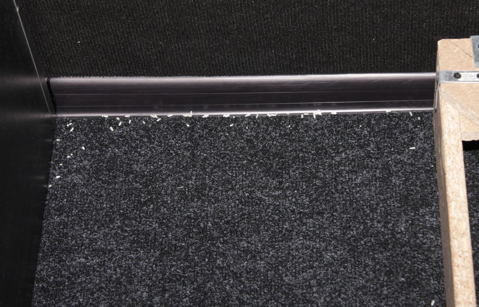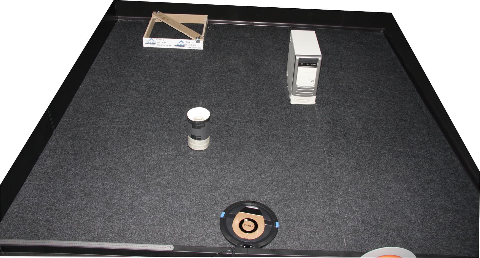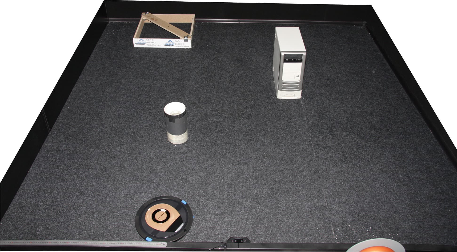 Уборка в тестовом помещении до разряда аккумулятора показала, что робот способен убрать почти весь мусор на доступной ему территории, немного риса осталось в углах, в тесном загончике и чуть-чуть около базы: