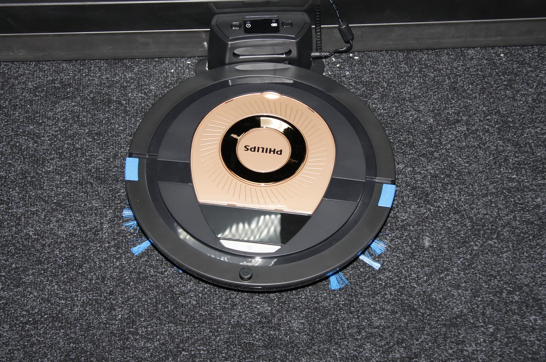 При уборке передние щеточки подгребает мусор к центру, а затем мусор через овальный патрубок засасывается в пылесборник. Паразитный подсос воздуха в какой-то мере устраняет подвижная (ход порядка 9 мм) синяя насадка с вырезом под патрубок и с резиновым скребком. Желоб-воздуховод на насадке способствует захвату легкого мусора сбоку от корпуса робота. Отметим конструкцию боковой щеточки — прямая и относительно жесткая щетина выходит прямо из центральной втулки. Мы предполагали, что эта щетина быстро потеряет форму, и эффективность щеточек снизится, однако даже по прошествии всех тестов щетина лишь слегка загнулась и почти не разлохматилась. В крайнем случае щеточки можно выпрямить под струей горячей воды. Установка и снятие боковых щеток не требуют никакого инструмента, что очень удобно, однако щеточки рукой не проворачиваются. Этот робот является пылесосом в классическом смысле, так как пыль засасывается непосредственно с очищаемой поверхности, боковые щеточки играют вспомогательную роль и непосредственно в пылесборник грязь не перемещают.