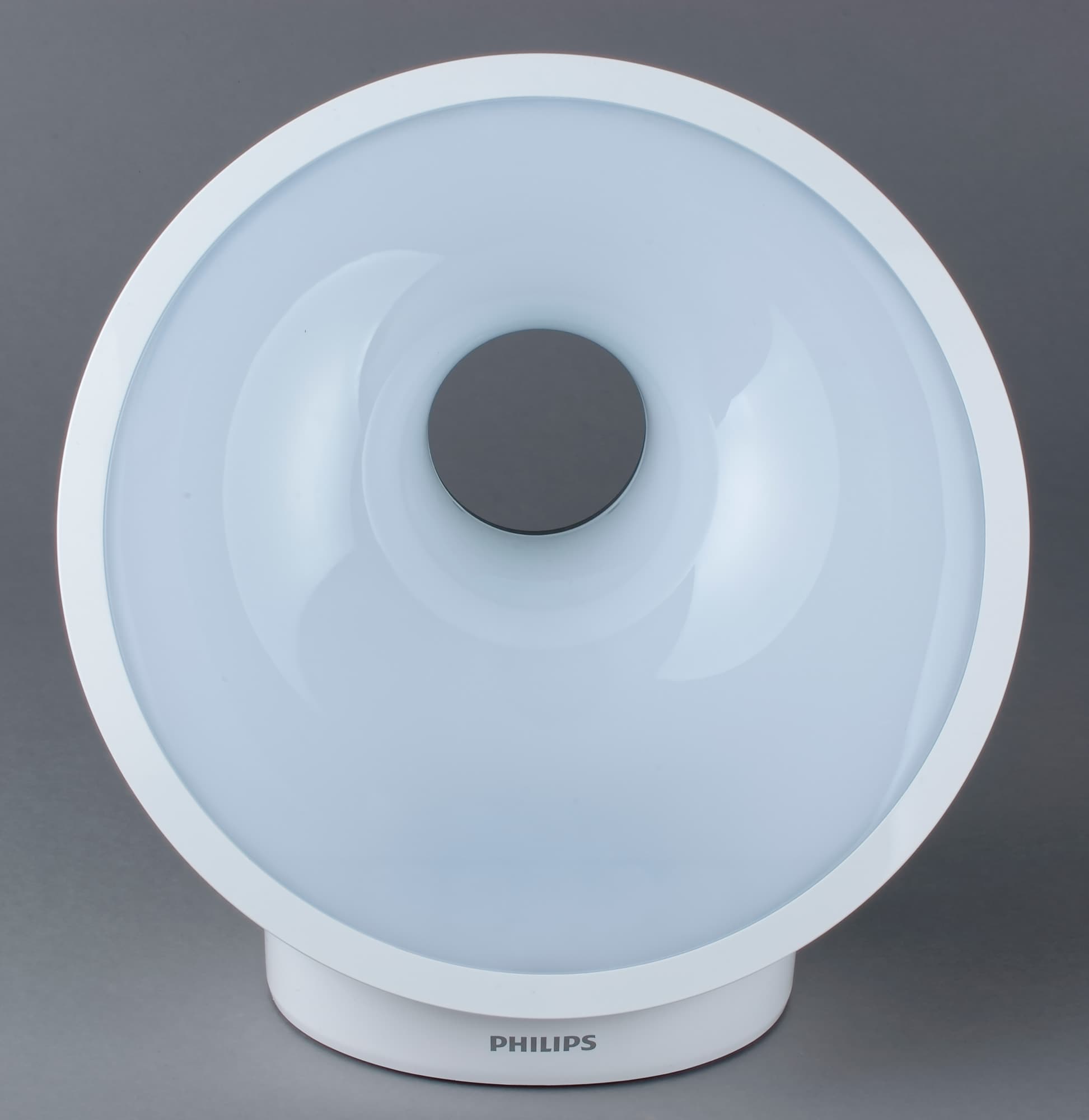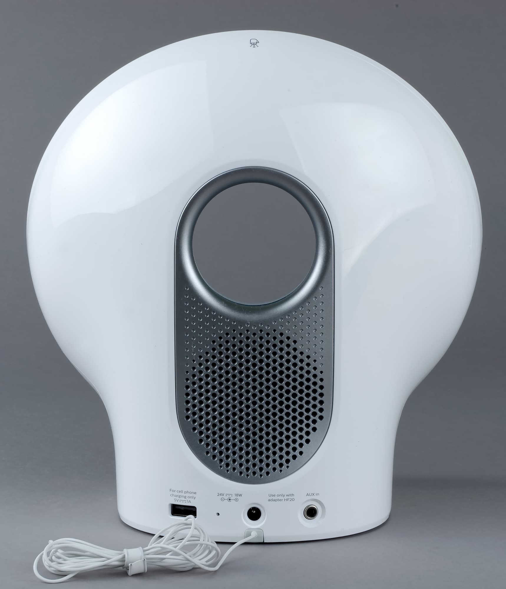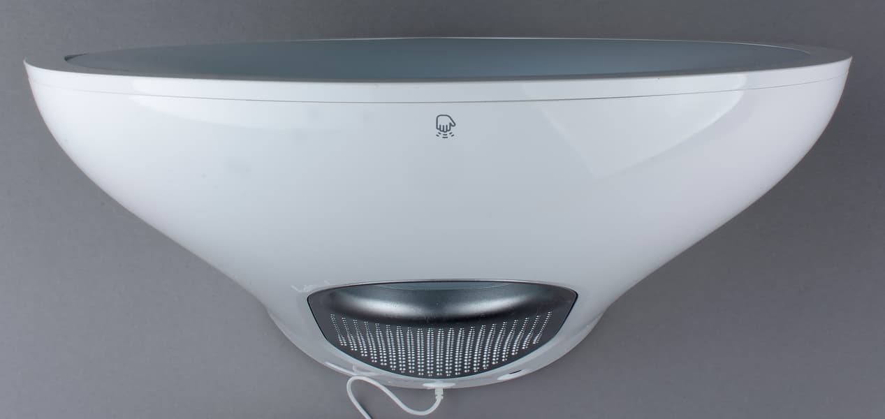 Передняя панель устройства представляет собой диск, наклоненный от пользователя и слегка вогнутый к круглому отверстию чуть выше геометрического центра. Внутренняя поверхность панели — это плафон светильника из молочно-белого стекла со светодиодными элементами внутри. Сенсорная панель управления и светодиодный дисплей расположены в нижней части диска и в выключенном виде не видны.