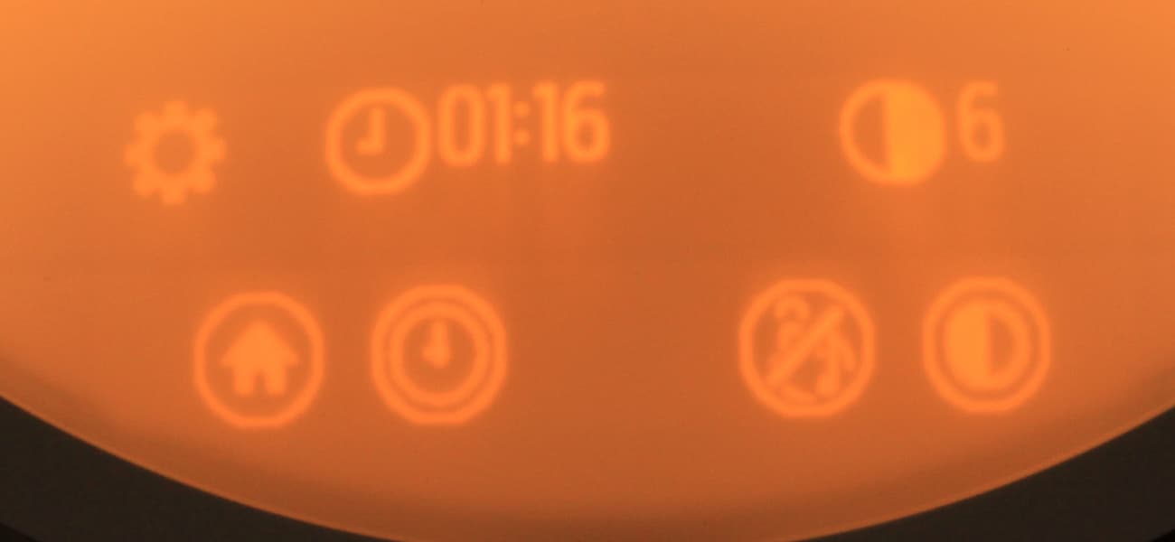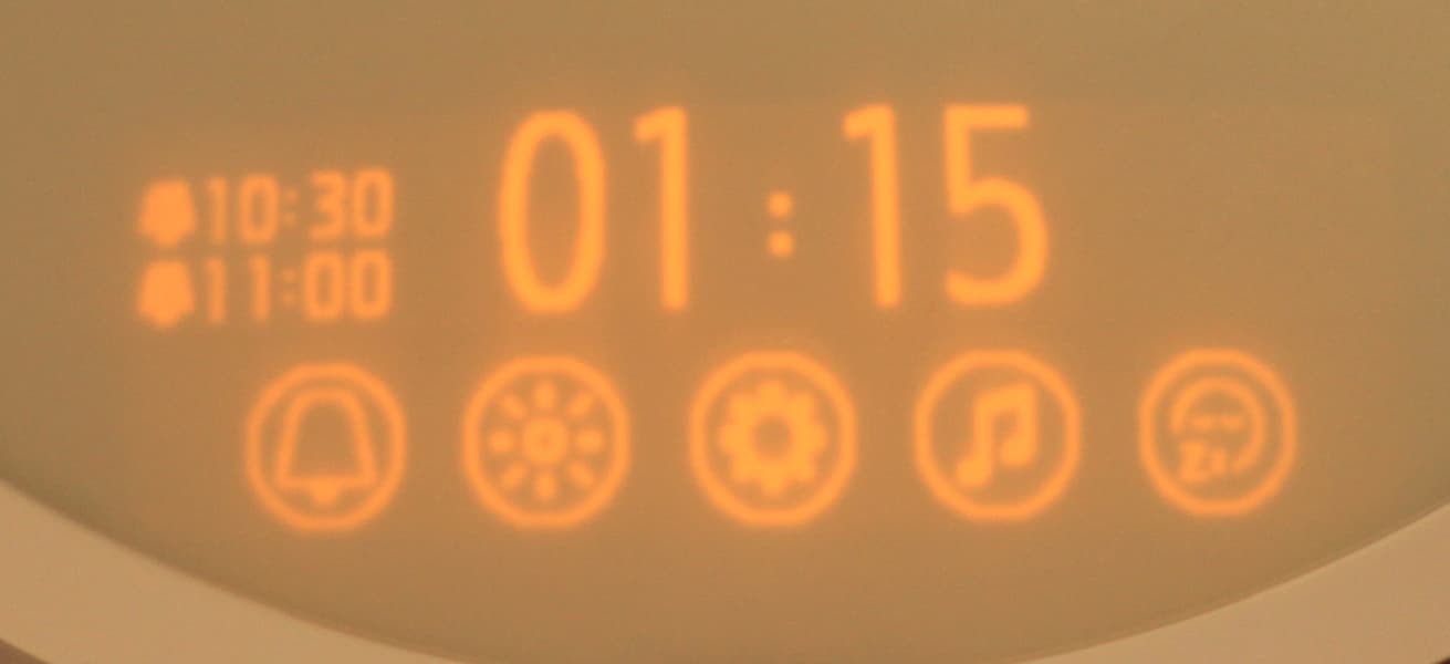В этих настройках пиктограмма с изображением часов позволяет выбрать время работы режима — от пяти минут до часа. Пиктограмма с изображением солнца регулирует интенсивность начального света будильника: от 1 до 25. В качестве источника звука (пиктограмма с нотами) можно выбрать 4 источника: три звука природы, радио, устройство пользователя и отсутствие звука. Настройки для этого меню аналогичны настройкам звуков для профиля пробуждения.