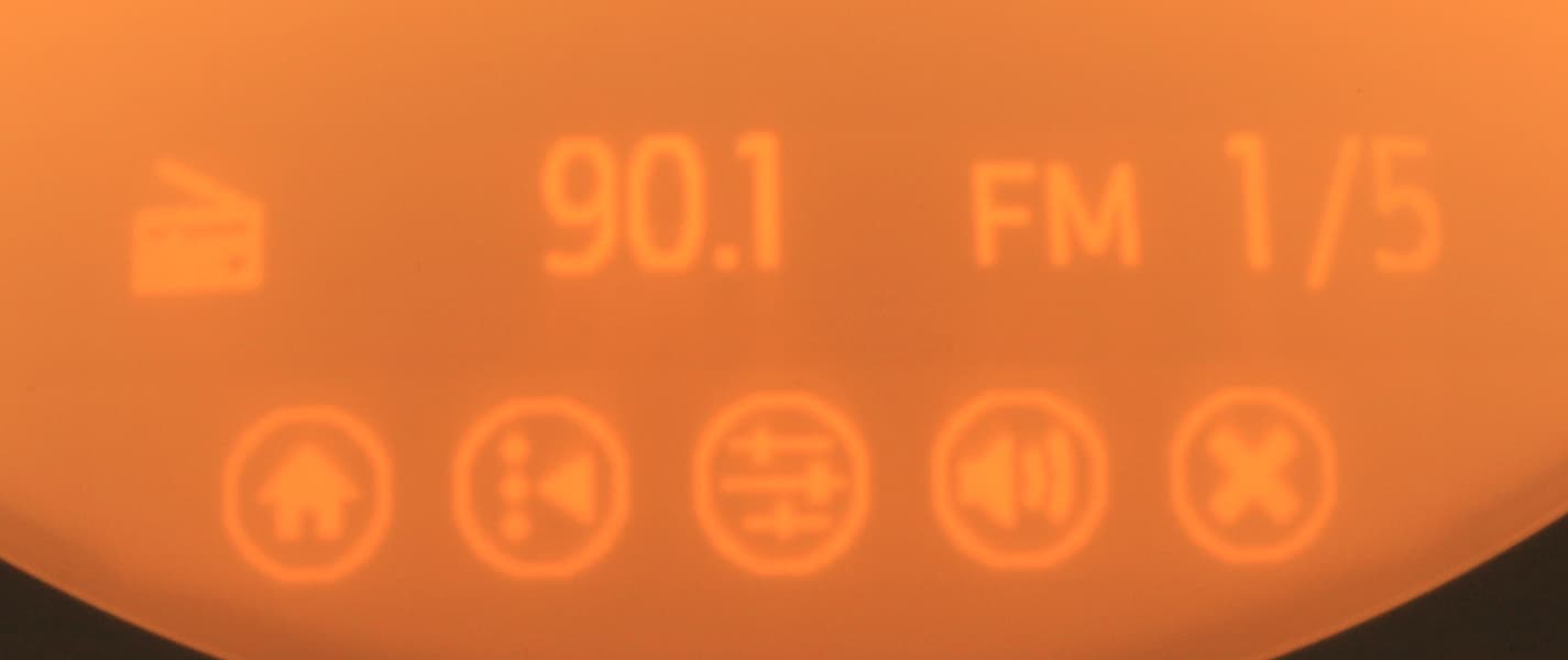 В предыдущем меню можно выбрать также источником FM-радио и попасть в меню настроек радио. Выбор из пяти установленных пользователем радиостанций осуществляется так же, как и при выборе установленных звуков. И в меню радиоволн, и в меню звуков есть кнопка громкости, с помощью которой можно перейти к регулировке максимальной интенсивности звука при пробуждении. С помощью кнопок «+» и «−» пользователь может отрегулировать силу звука от единицы до 25.