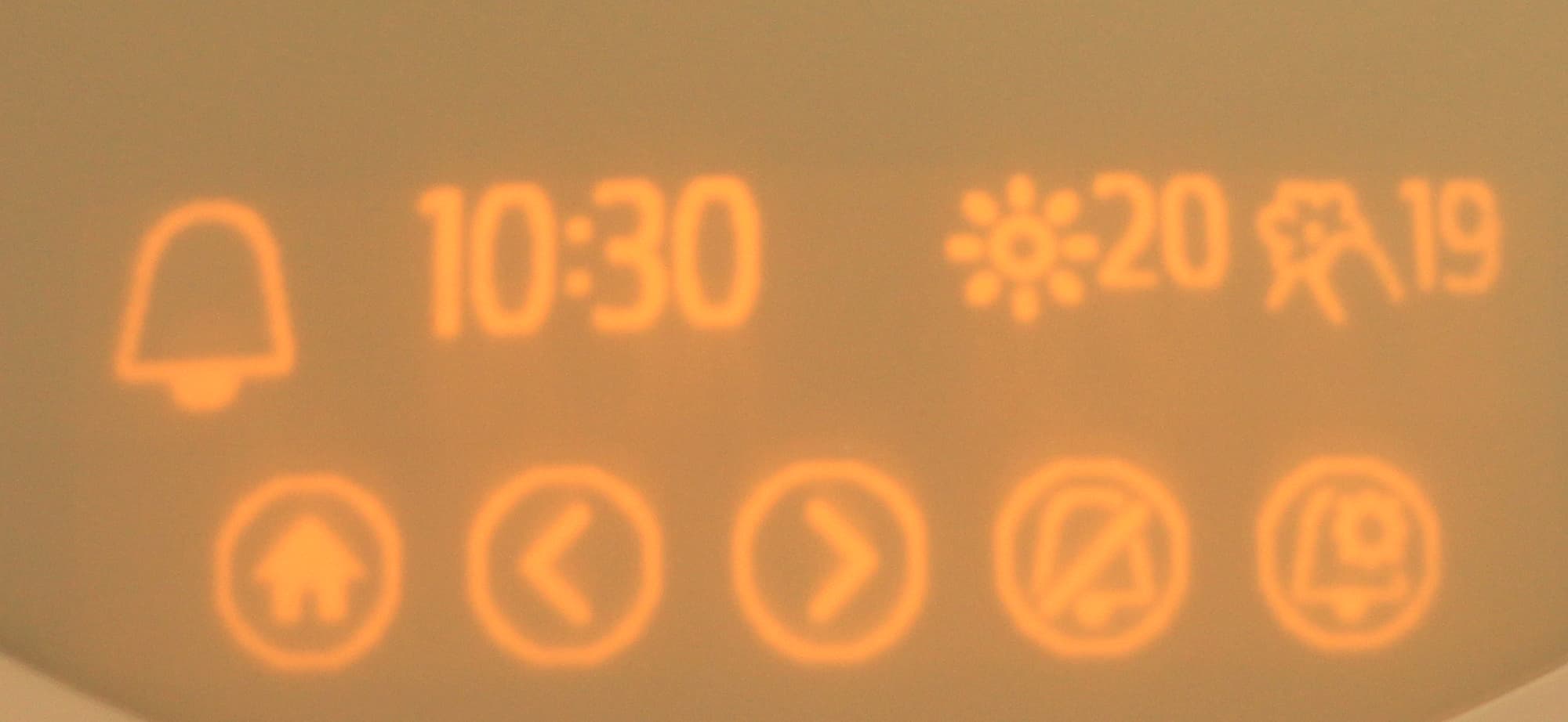 Управление будильником осуществляется с помощью сенсорных кнопок на дисплее устройства. В режиме покоя видна только кнопка Home (пиктограмма, изображающая дом; полный список соответствия пиктограмм и функций приведен в руководстве).