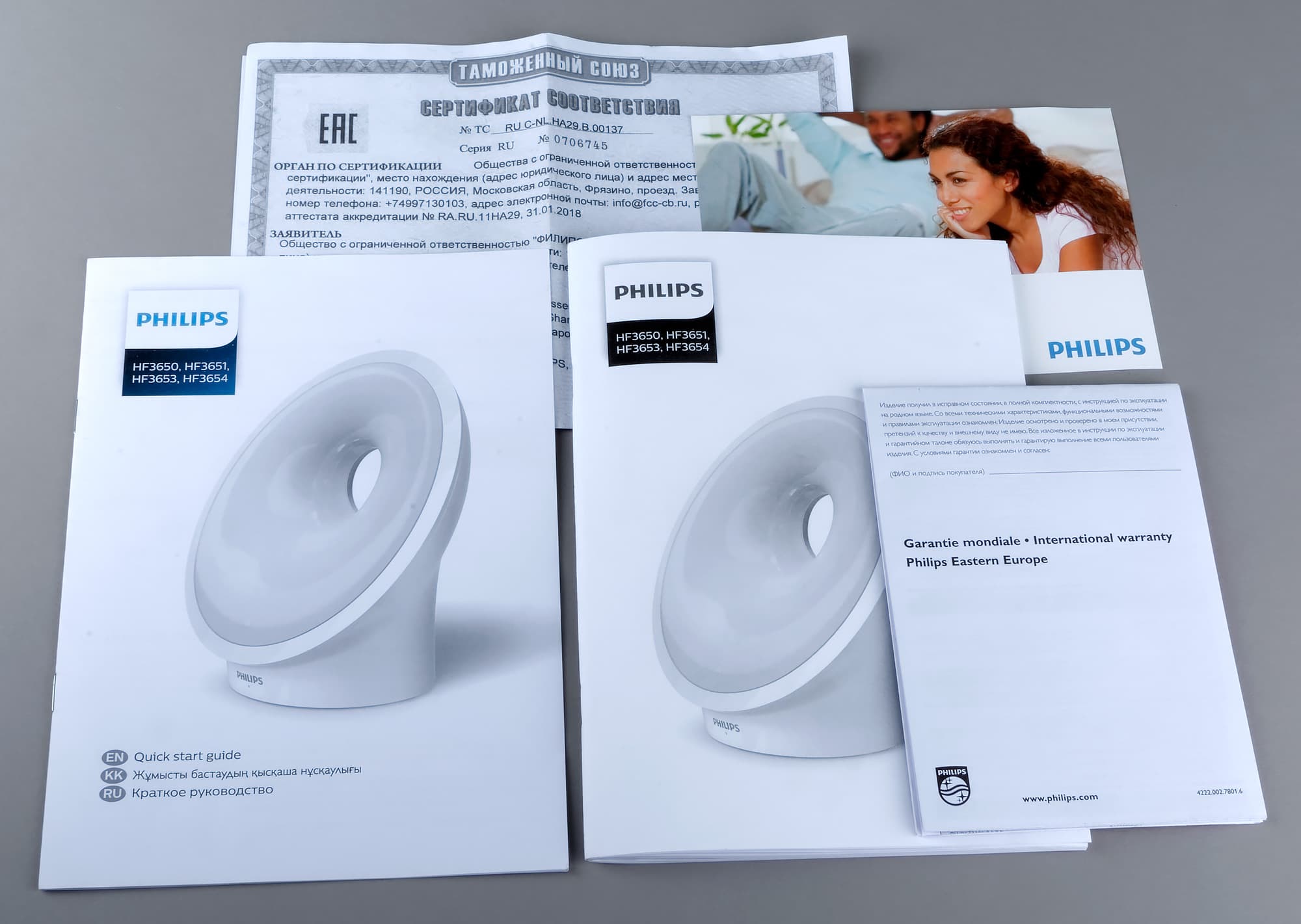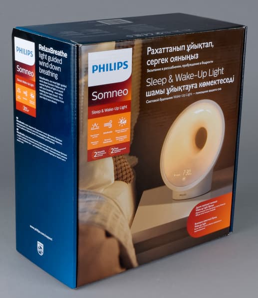Одну из боковых стенок занимает сообщение на трех языках о том, что в коробке будильник, разработанный опытным производителем для того, чтобы пользователь мог расслабляться перед сном и просыпаться естественным образом. На второй боковой стенке есть описание функции Relax&Breathe: это интеллектуальное управление светом, которое помогает успокоиться и задать нужный для засыпания ритм дыхания.