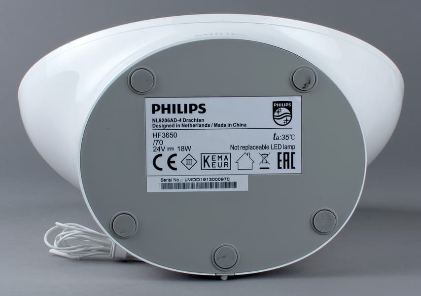 На овальном основании будильника есть пять круглых ножек с прорезиненными накладками, исключающими скольжение устройства на гладких поверхностях. Также на основании размещен шильдик с логотипом компании, серийным номером и технической информацией. В частности, на нем указано, что LED-лампа светильника не подлежит замене.