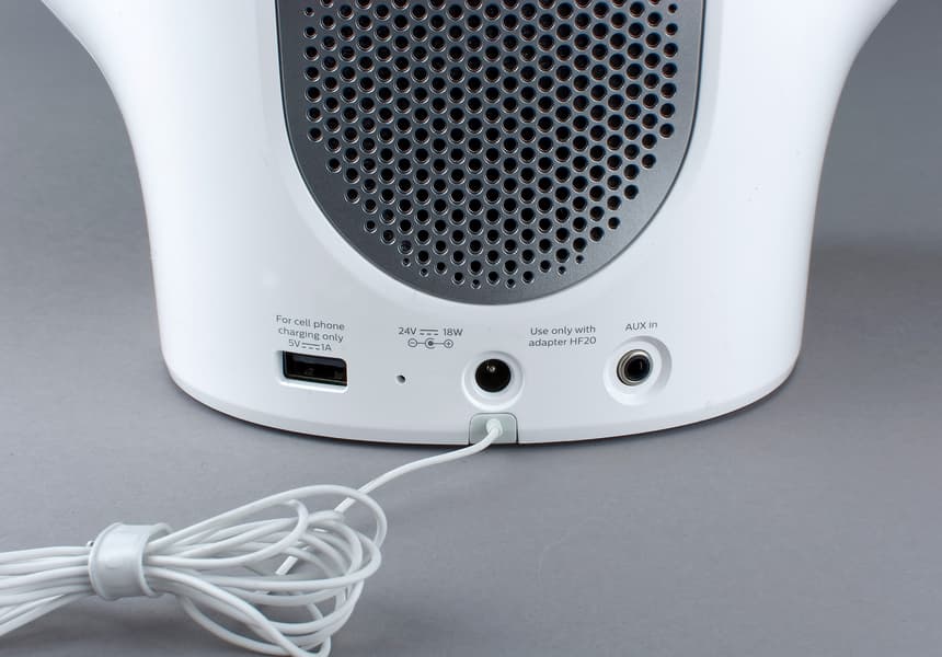 Если будильник размещается на прикроватной тумбе, его логично и удобно использовать в качестве зарядки для телефона — одноамперный разъем USB на задней панели будильника прекрасно подходит для «медленной» зарядки в течении ночи. Быструю зарядку устройство не поддерживает.