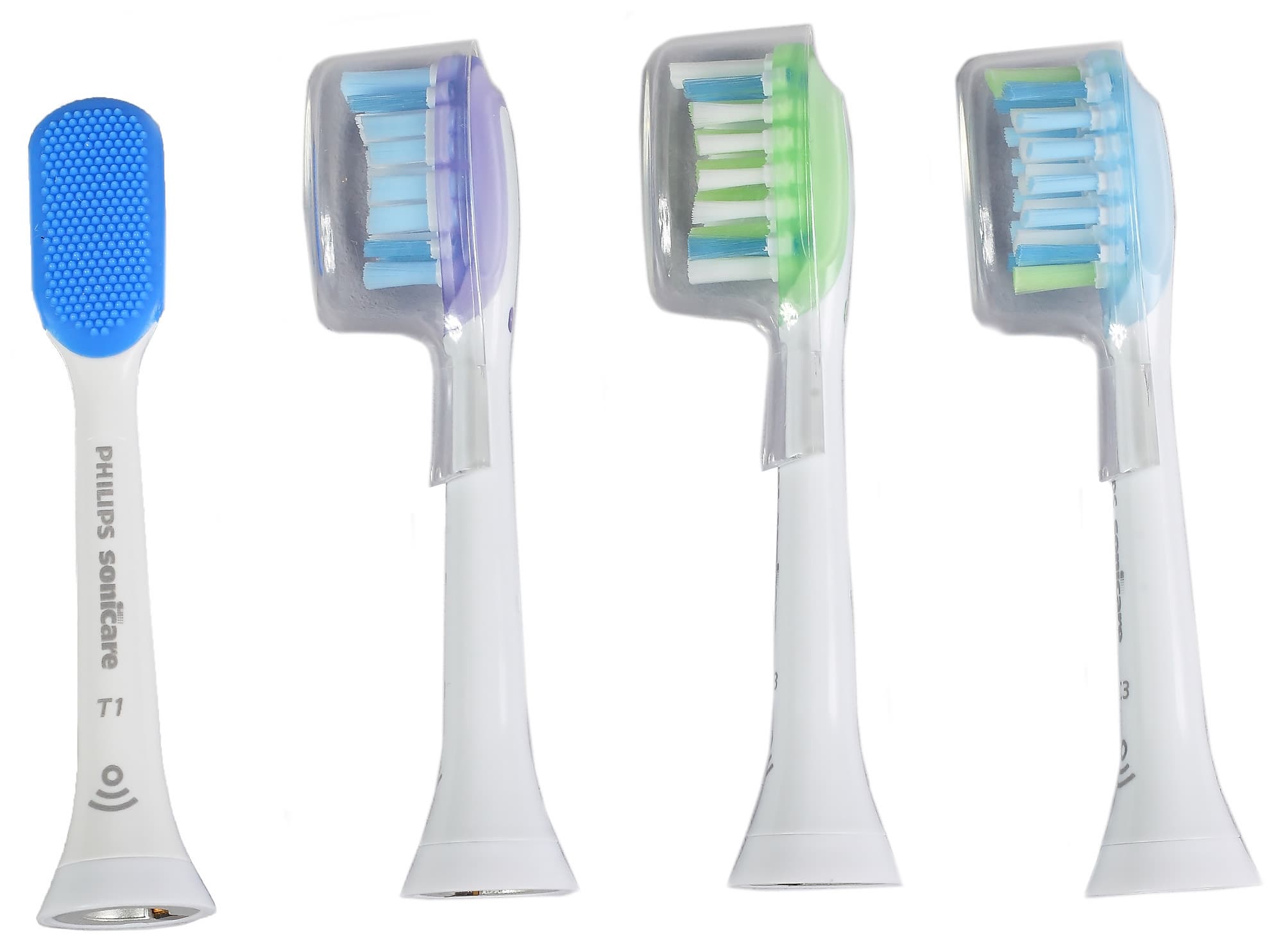 Все четыре прилагаемых к Sonicare насадки предназначены для разных целей. Каждая содержит чип, позволяющий щетке их распознавать и автоматически запускать нужную программу. Насадка также промаркирована цифро-буквенным обозначением, которое поможет пользователю выбрать способ чистки вручную. Расшифровка этих обозначений есть в приветственной карточке (но ее нет в руководстве пользователя, там насадки названы полным названием).
