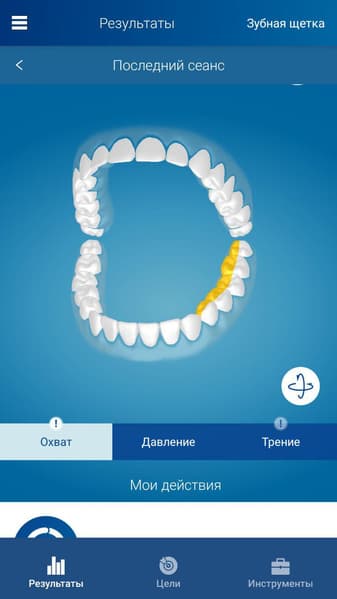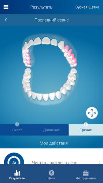 Если слишком сильно давить на щетку или чересчур активно ею чистить, то приложение попросит ослабить давление или не совершать слишком много движений. Через некоторое время такое ненавязчивое руководство приводит к тому, что рука привыкает двигать щетку оптимальным образом.
