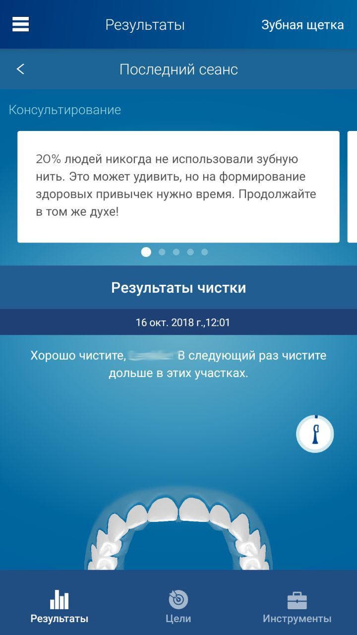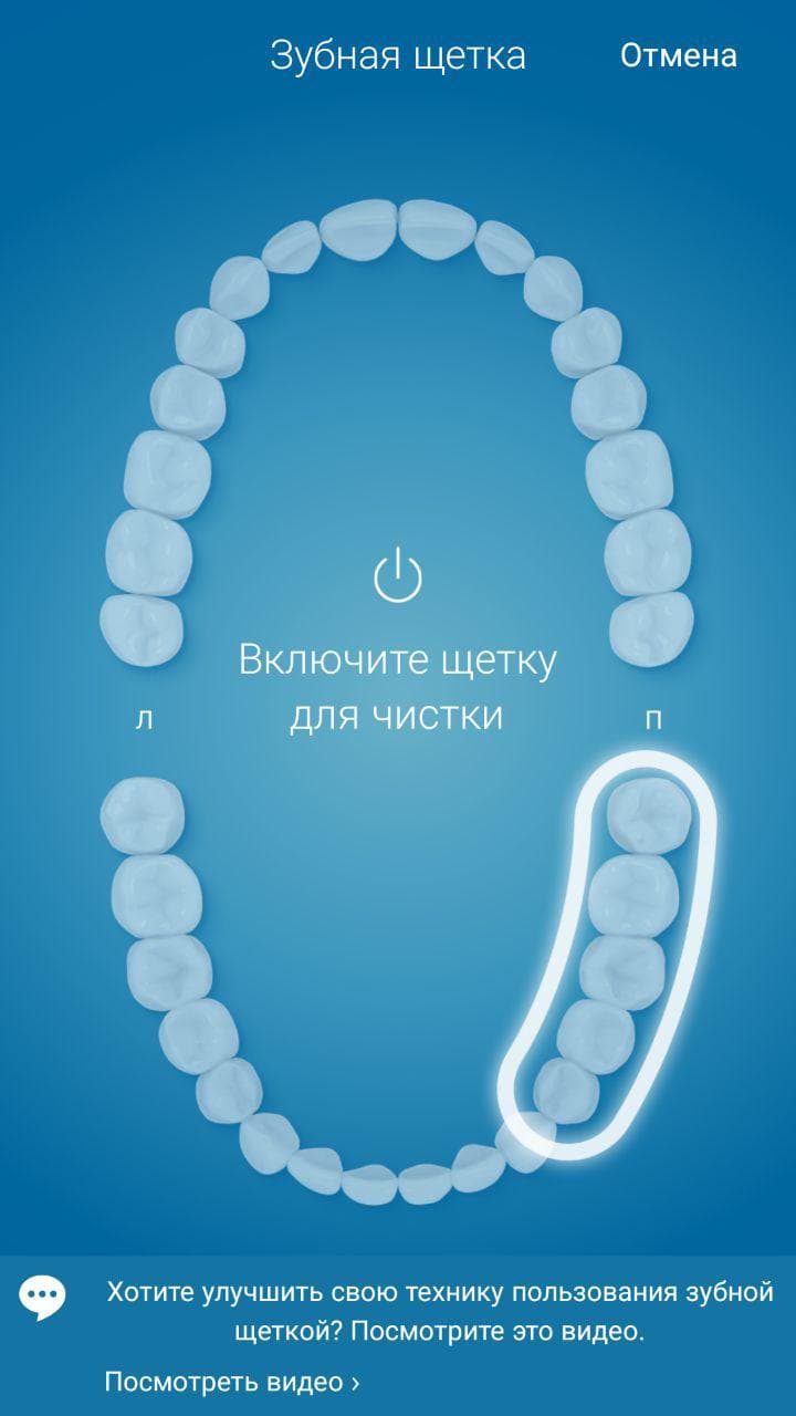 Когда щетка подключена, приложение покажет ценный совет из области ухода за зубами и предложит начать чистку. Теперь нажимаем кнопку включения щетки и следуем советам приложения, с какого участка зубов надо начинать. По умолчанию это верхний правый, но эту настройку всегда можно изменить.