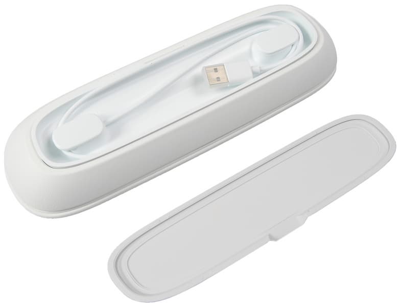 Как зарядное устройство может работать и дорожный футляр. Для этого на его дне есть сразу заметная крышка, открыв которую, мы нашли провод для связи с ноутбуком. Вставив USB-разъем этого провода в соответствующее гнездо компьютера, мы услышали звук, соответствующей старту зарядки аккумулятора, а на корпусе щетки замигал белый индикатор зарядки. Конечно, мощность такого устройства питания меньше, а потому полная зарядка займет больше времени.
