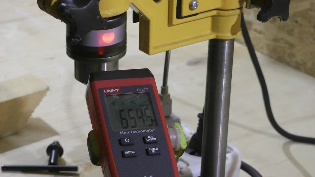 Рычаг пуска двигателя нажимается со средним усилием и утапливается на глубину 8 мм. Первый миллиметр хода рычага — холостой, и на изменение скорости вращения шпинделя остается семь миллиметров. При этом рычаг пуска имеет еще один орган управления — колесико, которым ограничивается максимальная скорость. Поворот до упора по часовой стрелке увеличивает максимальную скорость в среднем до 655 об/мин, против часовой — ограничивает скорость примерно 340 оборотами. Абсолютно точные значения скорости определить нельзя, их не существует. Скорость вращения всегда имеет какую-то погрешность, величина которой зависит от множества факторов, от массы патрона и окружающей температуры до напряжения в сети.