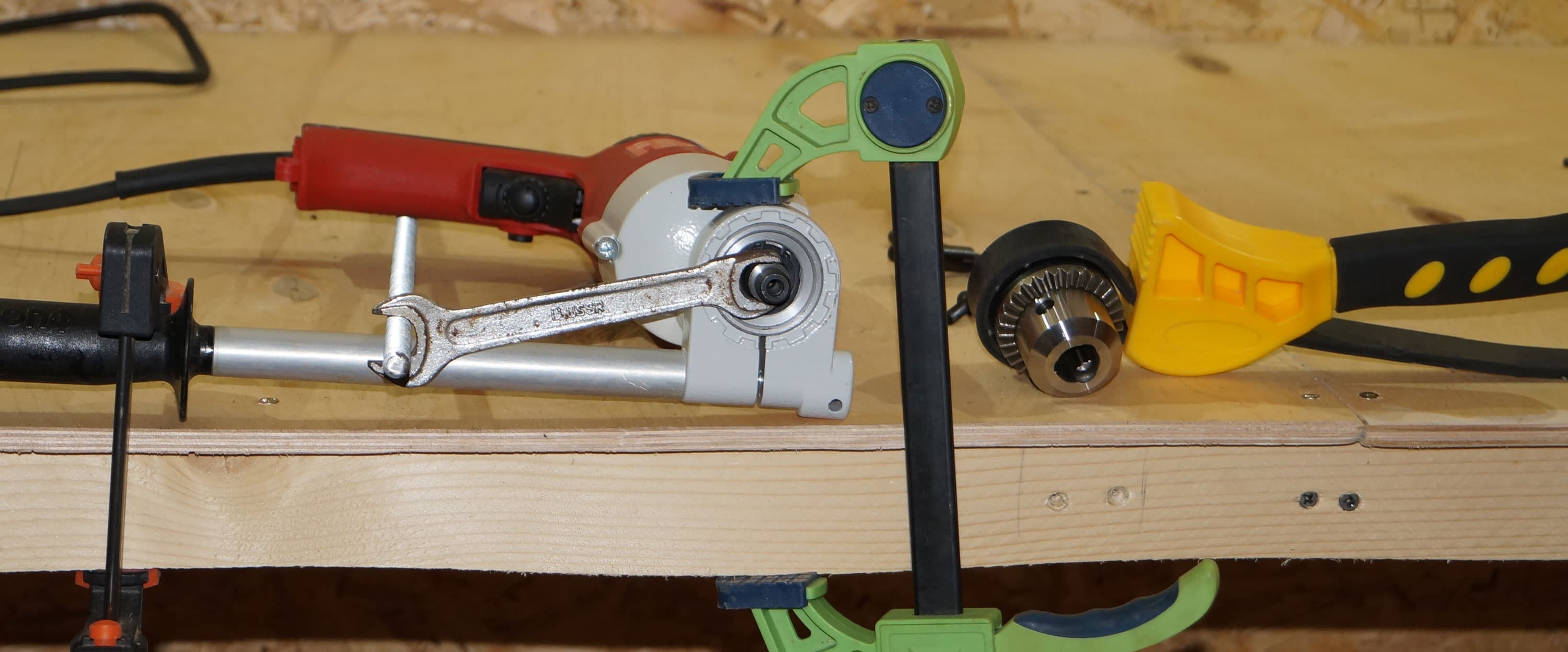 В одиночку это сделать непросто, но можно соорудить несложную конструкцию из струбцин. Теперь, когда вал двигателя надежно зафиксирован, патрон можно отвинтить газовым ключом, а лучше мягким ремешковым ключом, чтобы не испортить поверхность патрона.