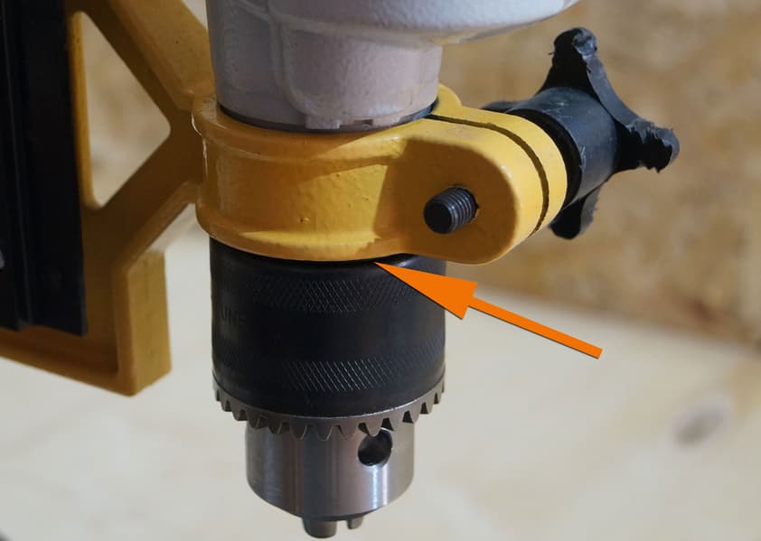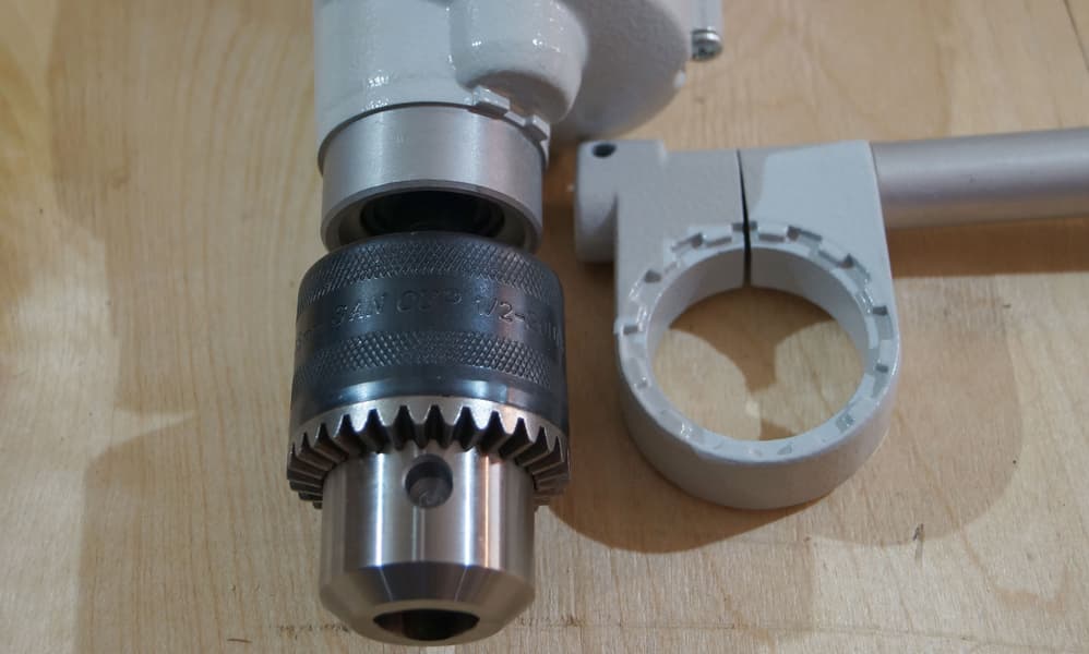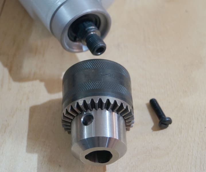 Получается, для того чтобы надеть рукоять или поместить дрель в стойку, нужно снять патрон. К счастью, это совсем несложно и довольно быстро. Сначала надо отвинтить внутренний болт, которым патрон фиксируется на валу, а затем отвинтить сам патрон.