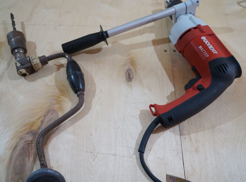 Вот теперь стало понятно на практике, зачем мощной дрели нужны: а) удлиненная рукоять и б) невысокая скорость оборотов двигателя. Рукоять предотвратила выворачивание рук при сверлении, а невысокая оборотистость не позволила оснастке нагреться. Если иная дрель с успехом пробивает 20 сантиметров дерева, то делает это исключительно за счет высокой скорости. Однако все это может кончиться пожаром, поскольку на больших оборотах любая оснастка обязательно нагреется так, что дерево начнет тлеть. Именно эту особенность мы имели в виду, когда говорили, что «даже сверлить можно по-разному». Иными словами: тише едешь — дальше будешь.