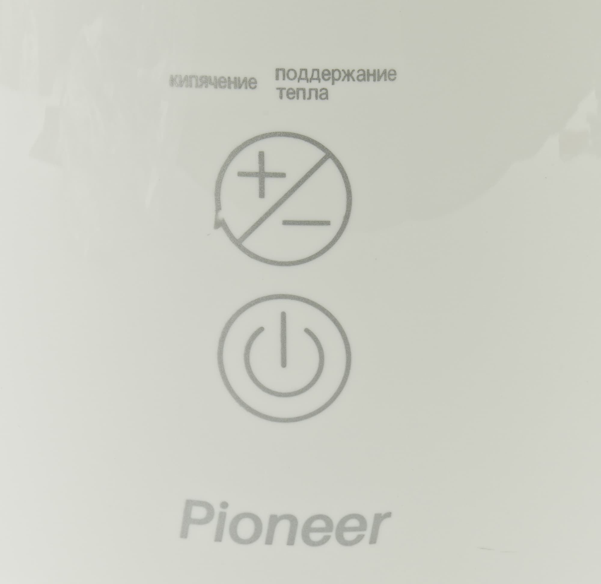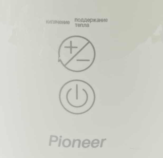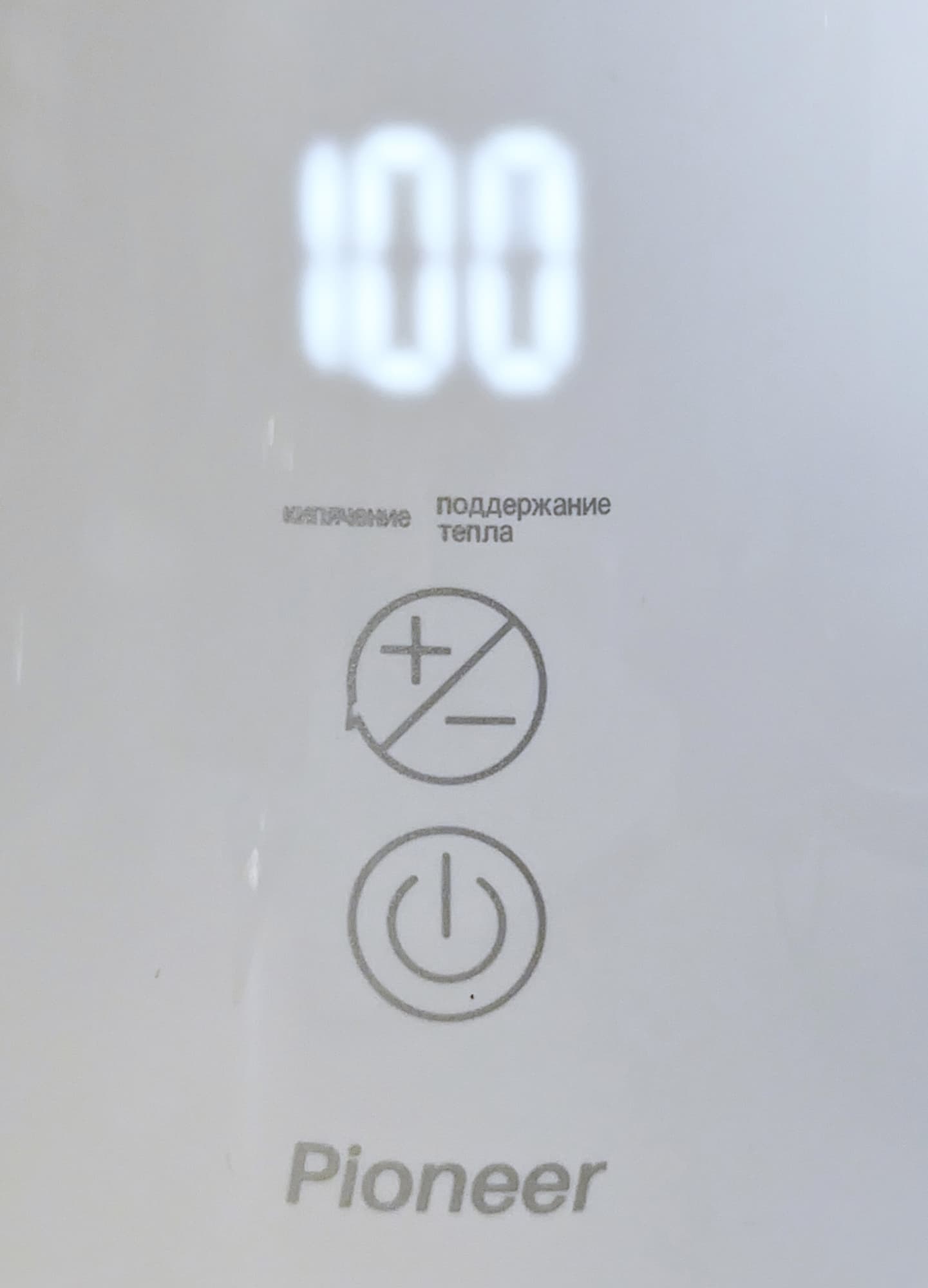 У Pioneer KE577M всего две сенсорные кнопки на левом боку корпуса. Нижняя отвечает за включение и выключение, верхняя позволяет выбрать уровень нагрева воды и включить режим поддержания температуры.