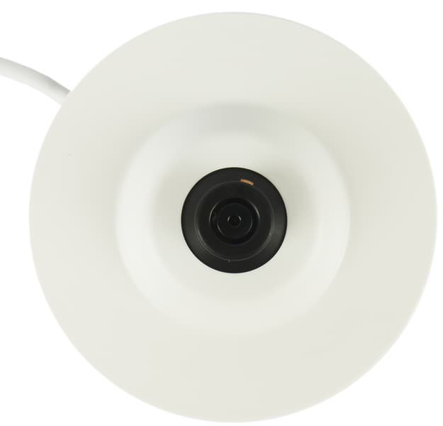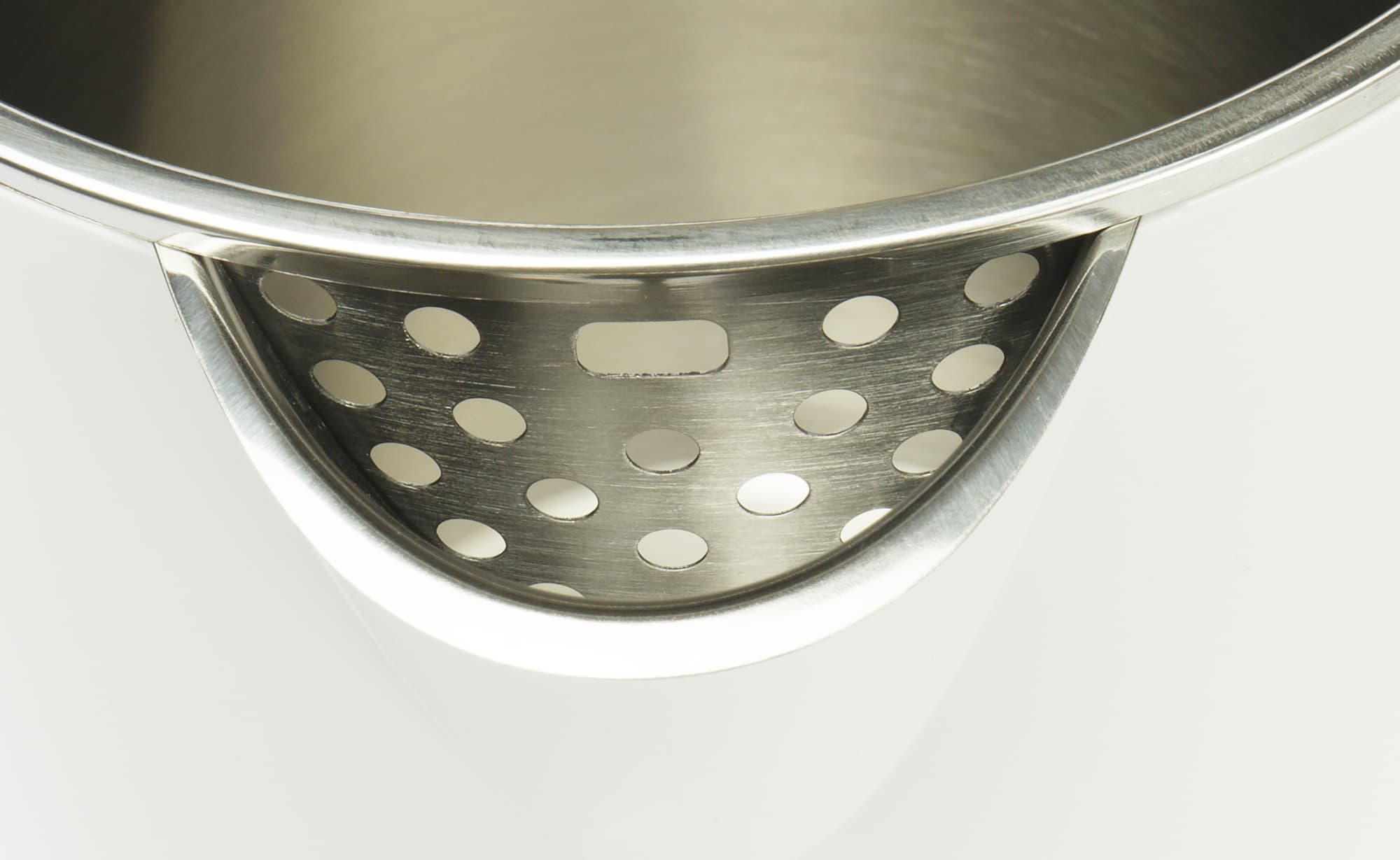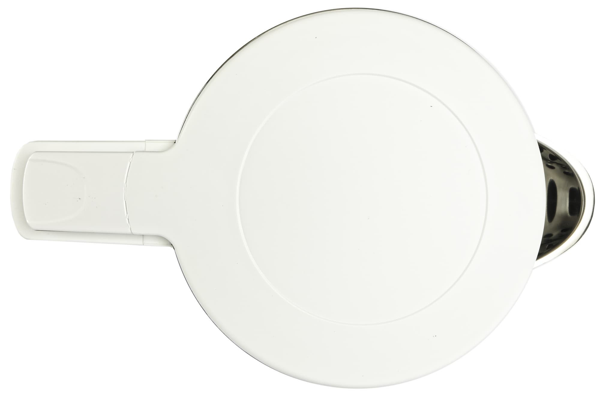 Внешний корпус чайника сделан из глянцевого белого пластика (производитель предлагает эту модель также в черном исполнении). Внутренняя часть — из нержавеющей стали. Место соединения по периметру верхнего края образует изящный декоративный ободок.