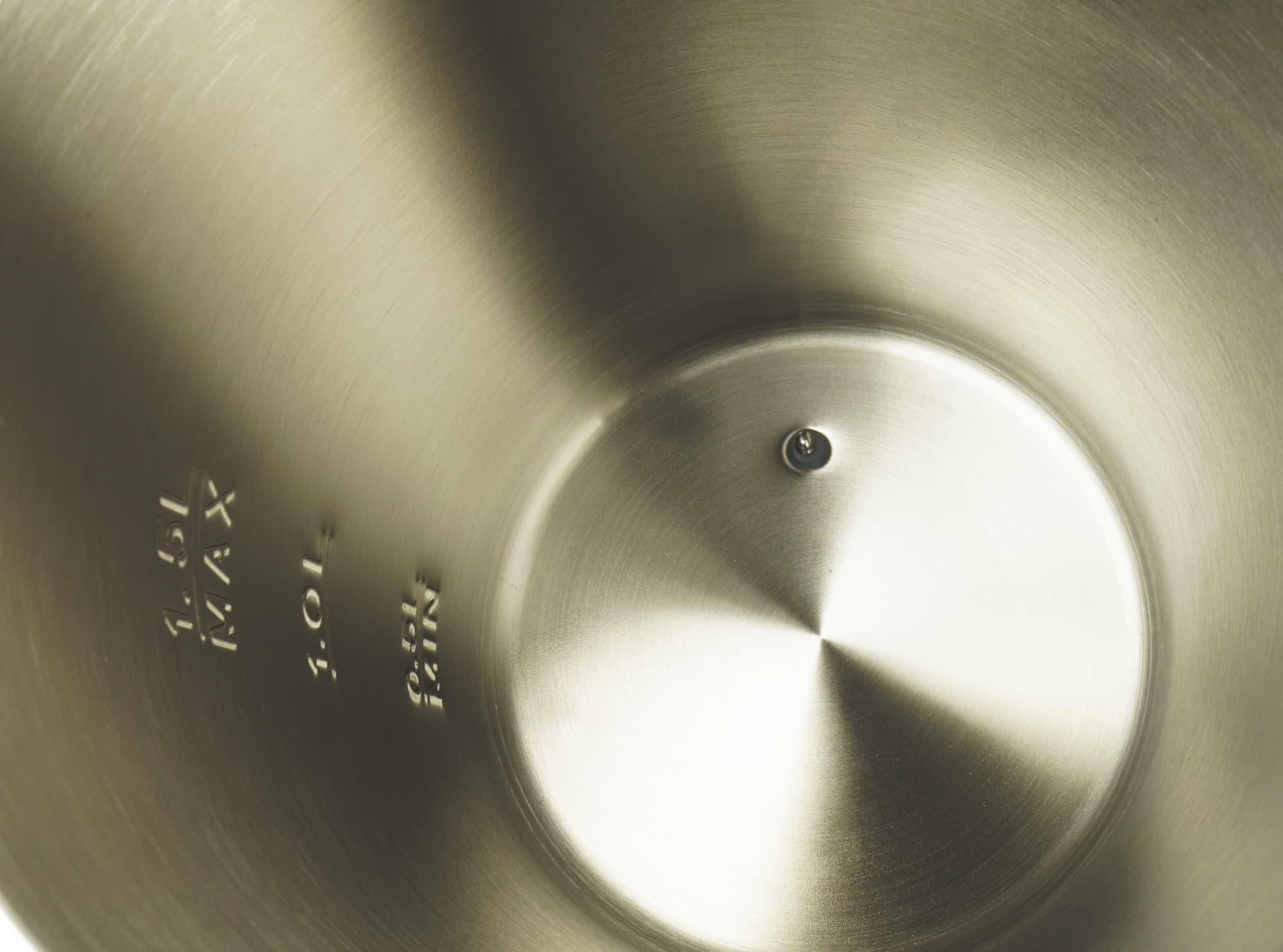 Внутренняя поверхность резервуара, напоминаем, сделана из нержавеющей стали (марку производитель не указывает). На боковой стороне выштампованы три метки: 0,5, 1,0 и 1,5 л (максимальный уровень).
