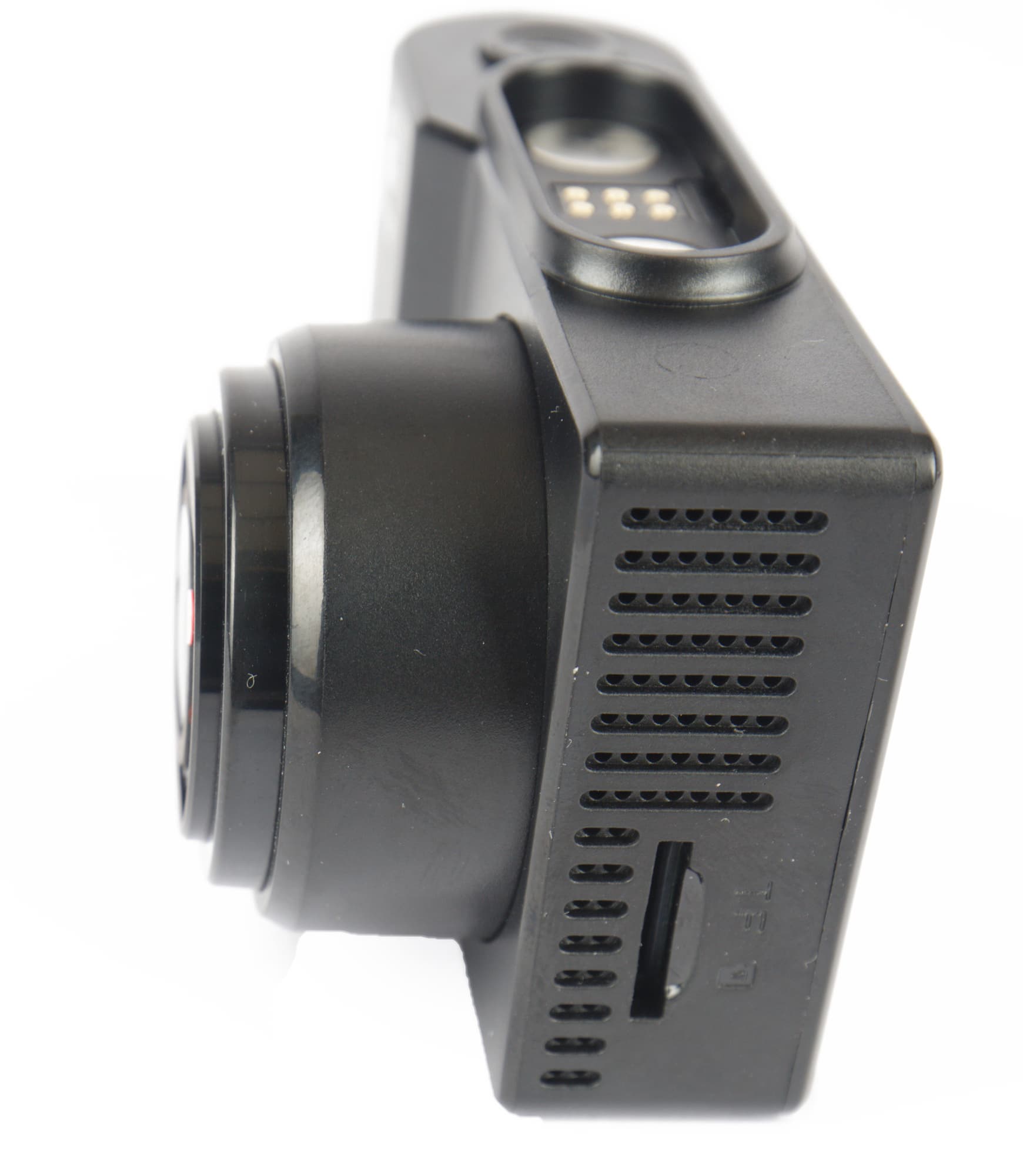 На левом боку устройства, рядом с вентиляционной решеткой, расположен слот для карты памяти формата microSD. Встроенной памяти у регистратора нет.