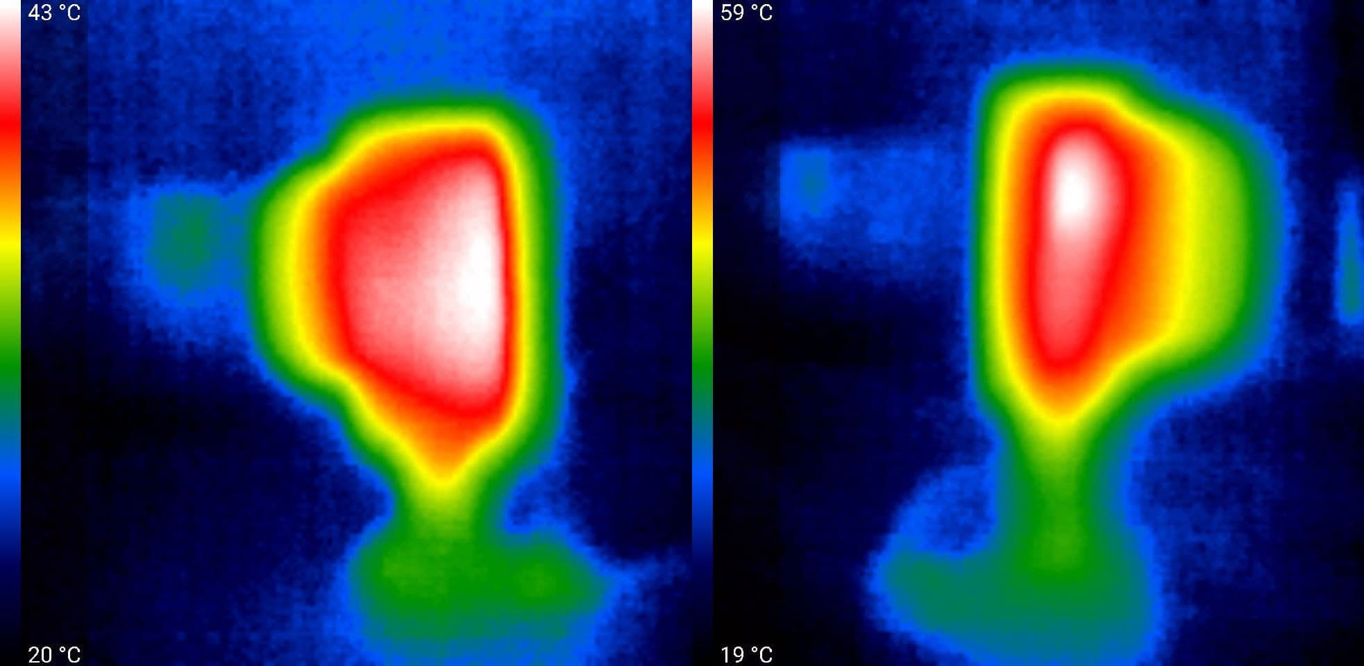 Во время длительной работы корпус аппарата ощутимо нагревается. Ниже приводятся тепловизионные снимки прибора, сделанные после нескольких часов непрерывной видеозаписи с работающим дисплеем. Питание регистратору подавалось стационарное, тестирование проводилось в комнатных условиях при температуре окружающего воздуха около 22 °C.