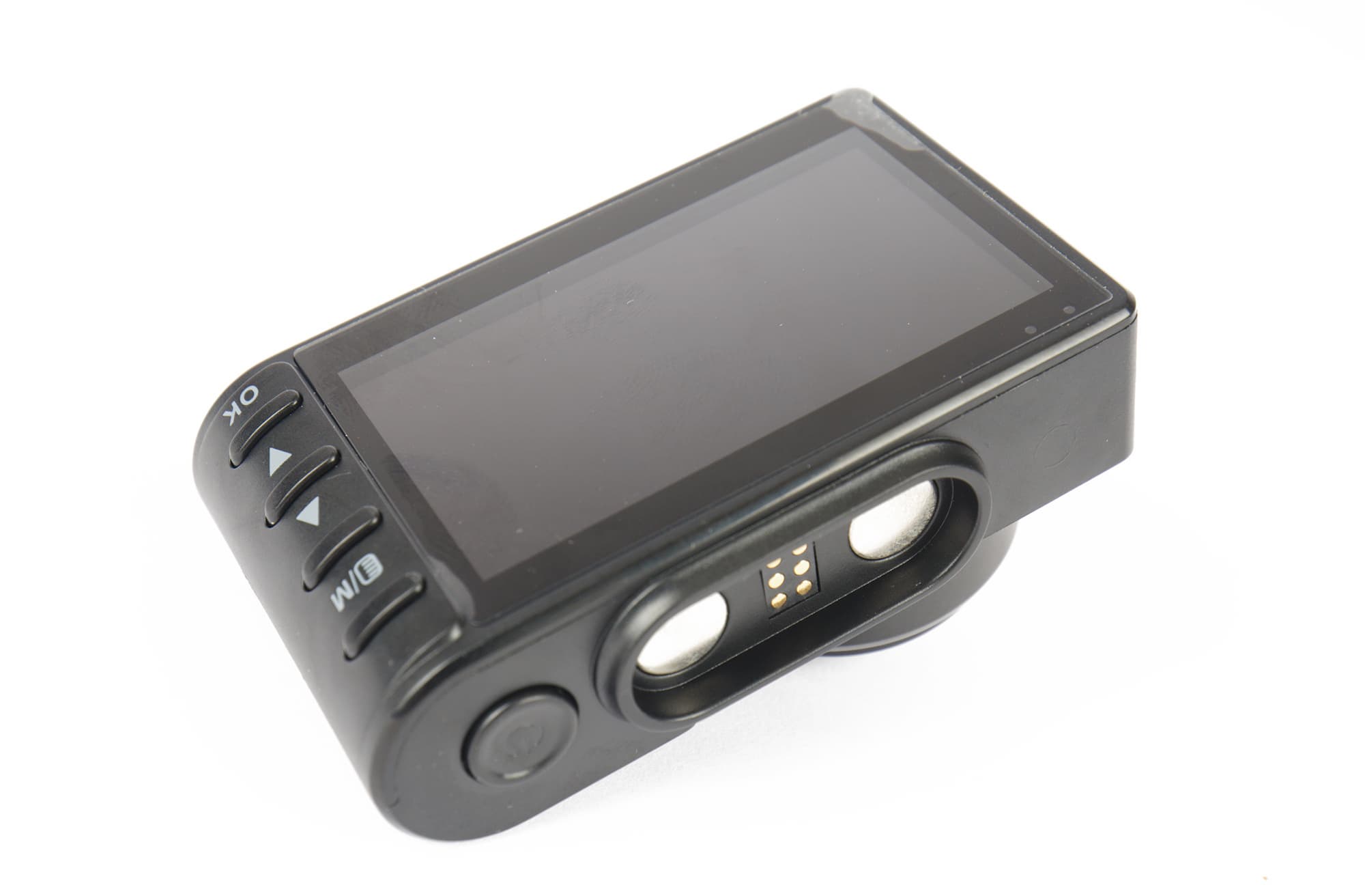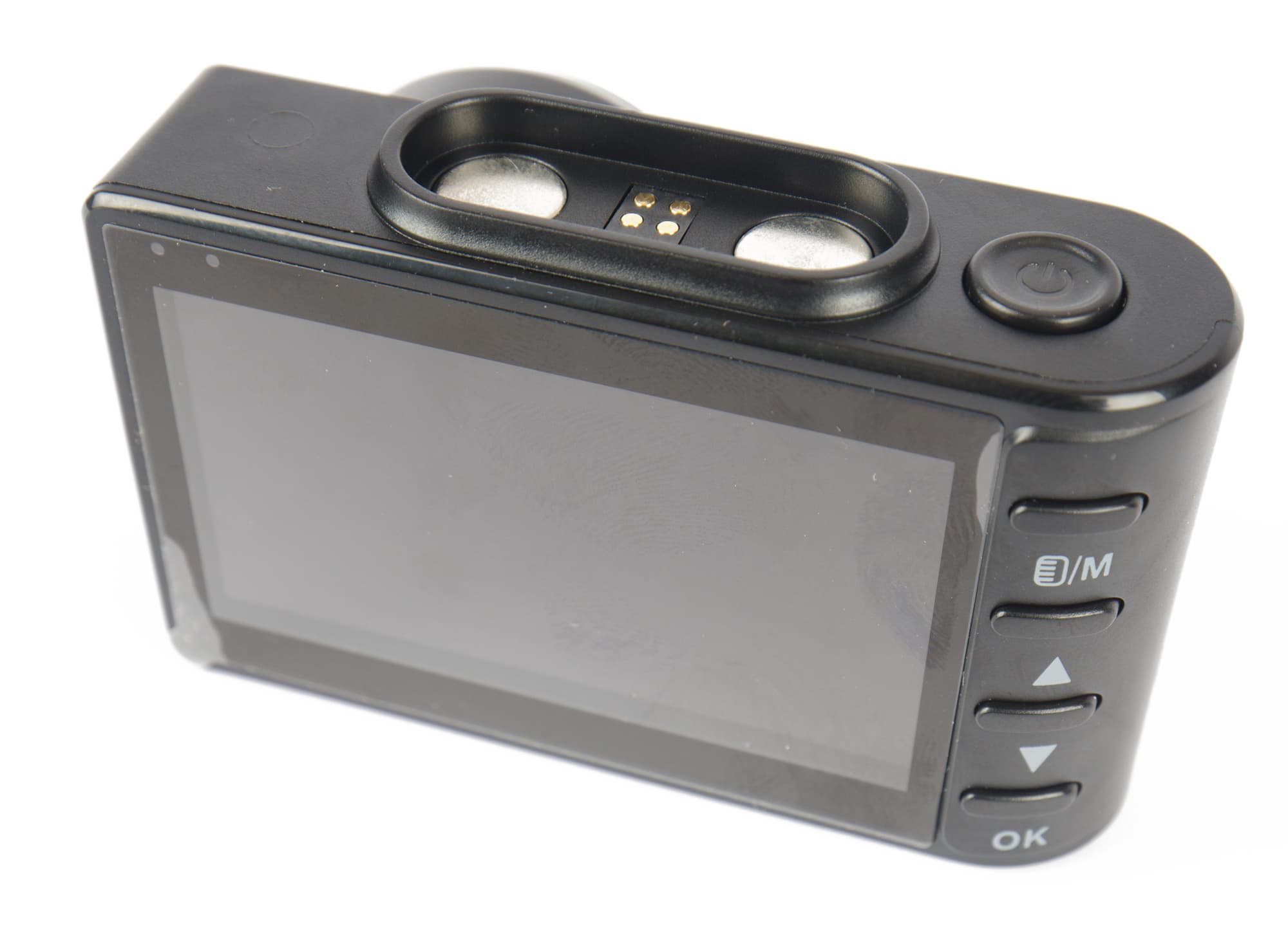 Органы управления регистратором мы предсказуемо нашли на задней, обращенной к водителю панели. Это четыре кнопки — Menu/Mode, Up, Down и OK. Чуть ниже мы более подробно остановимся на их функциях.