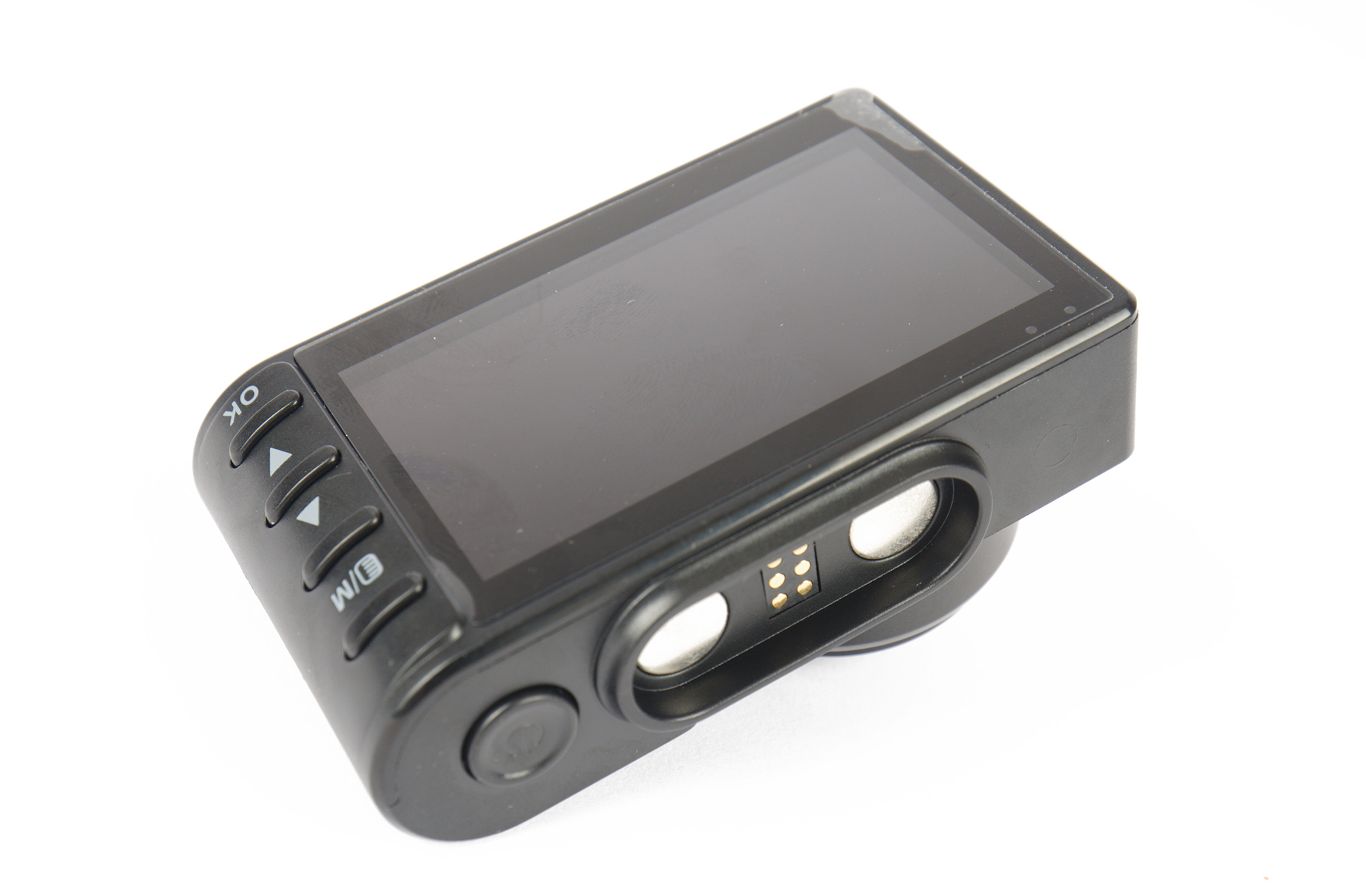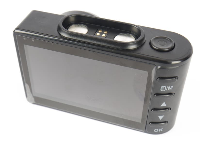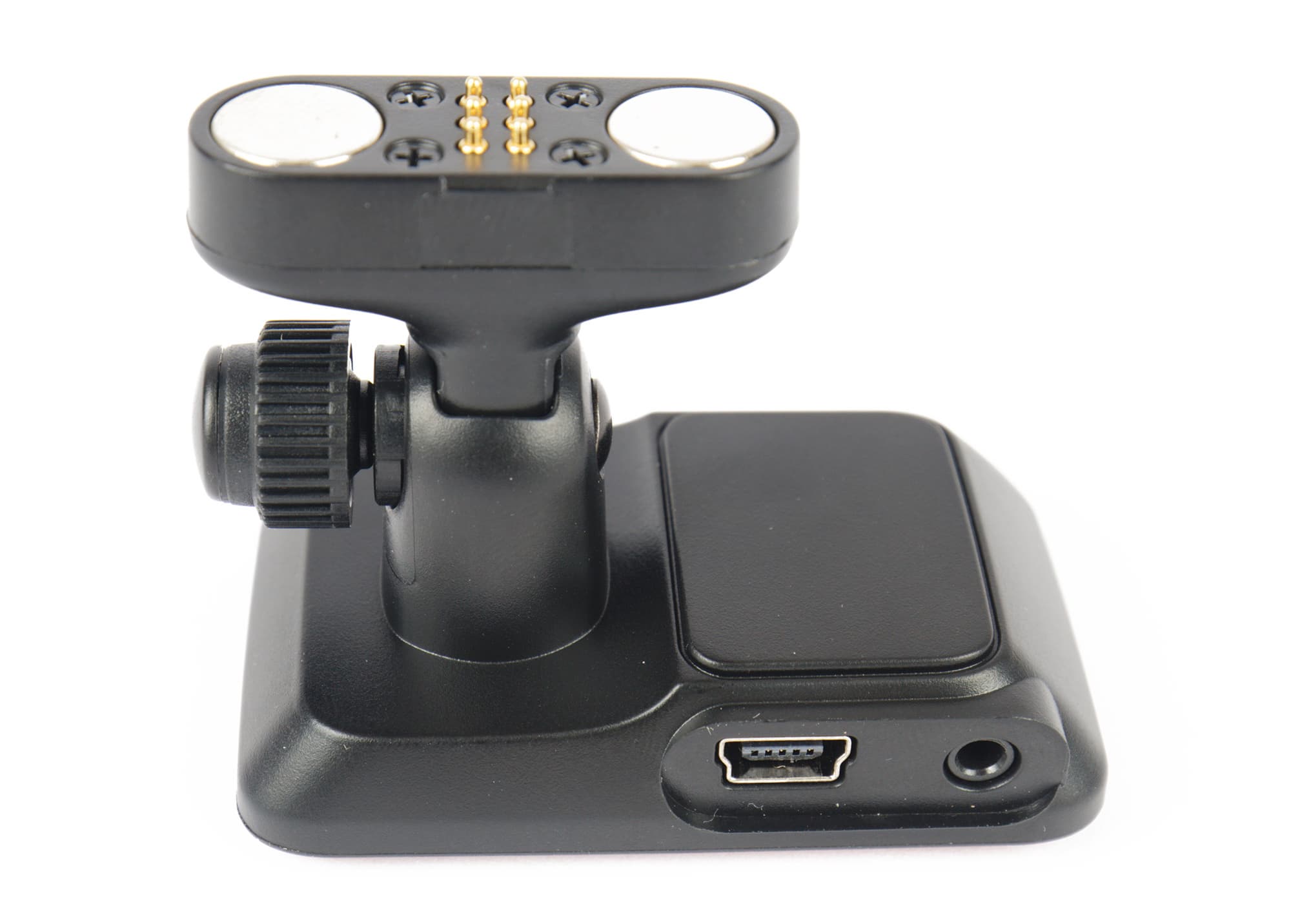 Контактная площадка крепления снабжена двумя мощными магнитами и может поворачиваться в одной плоскости — вверх и вниз. Ориентация полюсов магнитов позволяет установить регистратор на креплении только в одном, правильном положении. Рядом с шарниром есть винт, фиксирующий площадку в выбранном положении. На корпусе крепления два разъема: Mini-USB для адаптера питания и миниджек для подключения камеры.
