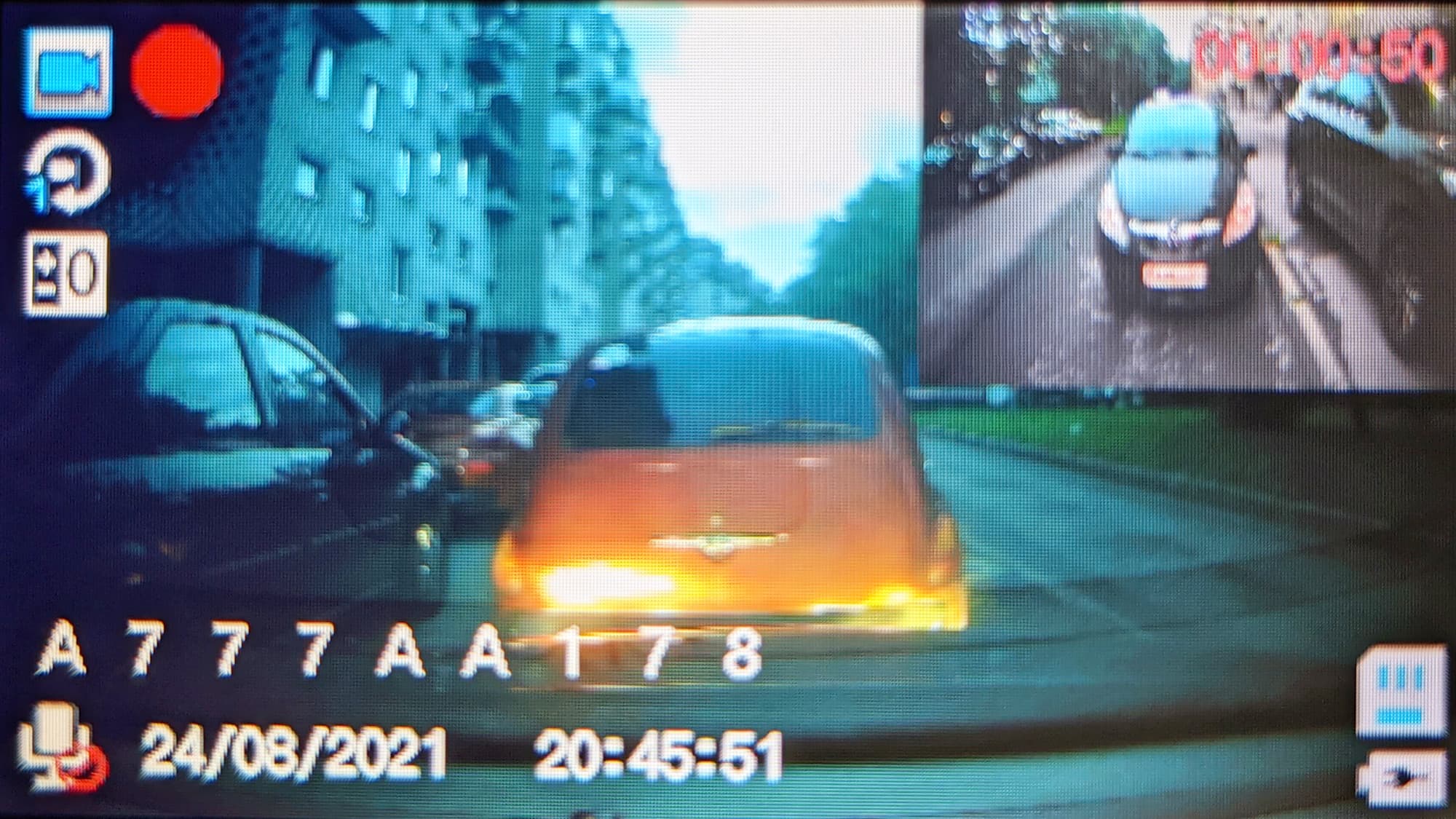 В левый нижний угол кадра регистратор впечатывает дату и время, а над ними — номер автомобиля, если тот был внесен пользователем при настройке устройства. Чуть правее располагается информация о модели устройства, отключить ее отображение нельзя.
