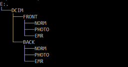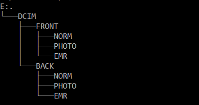 Во время записи регистратор разбивает материал на отрезки заданной длительности, от 1 до 5 минут. Данные сохраняются на карте в каталоге DCIM в подкаталогах FRONT и BACK, для передней и задней камер соответственно. В обоих подкаталогах есть папки NORM (обычное видео), PHOTO (фотографии, сделанные пользователем) и EMR (видео, cохраненное по сигналу датчика удара).