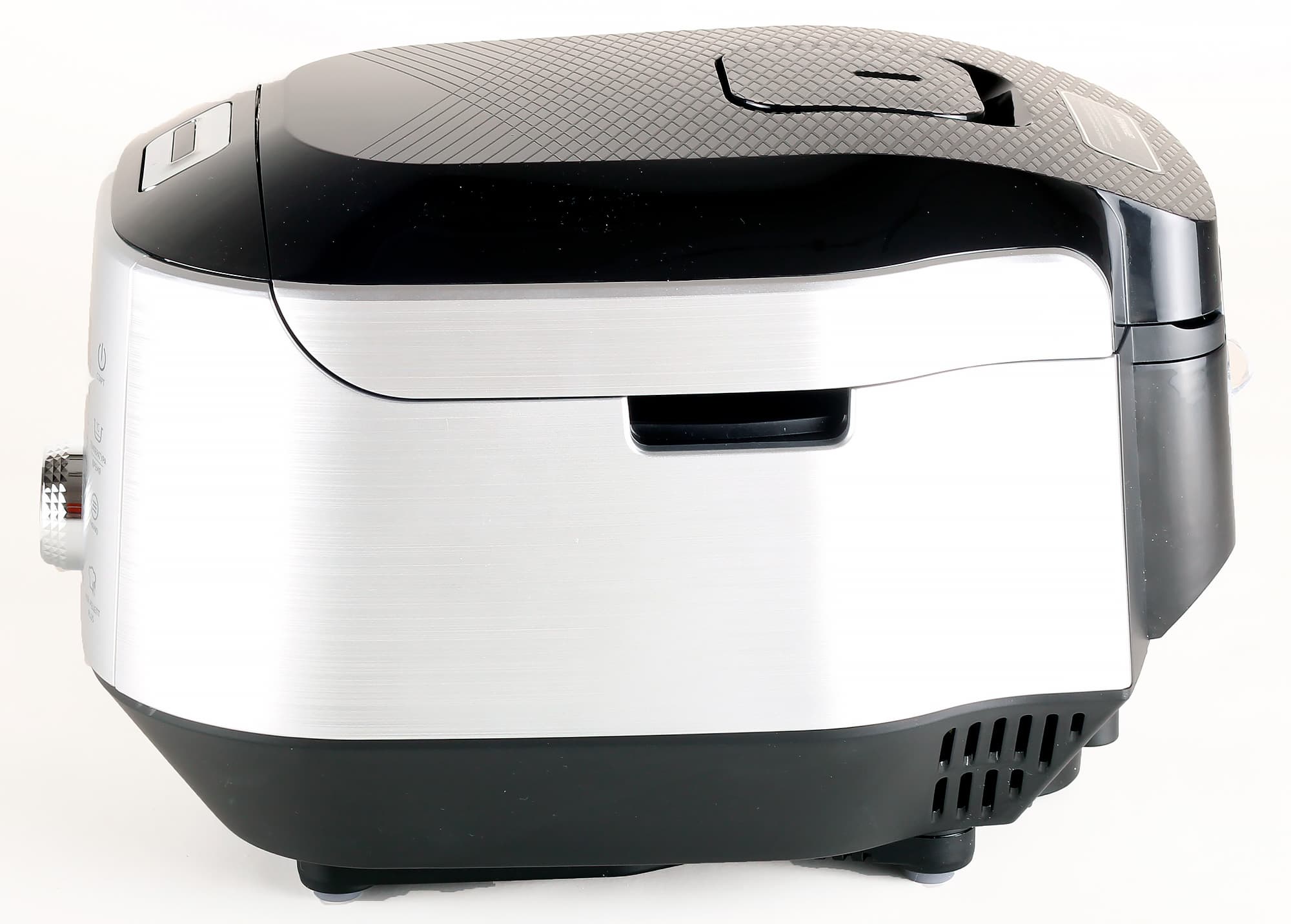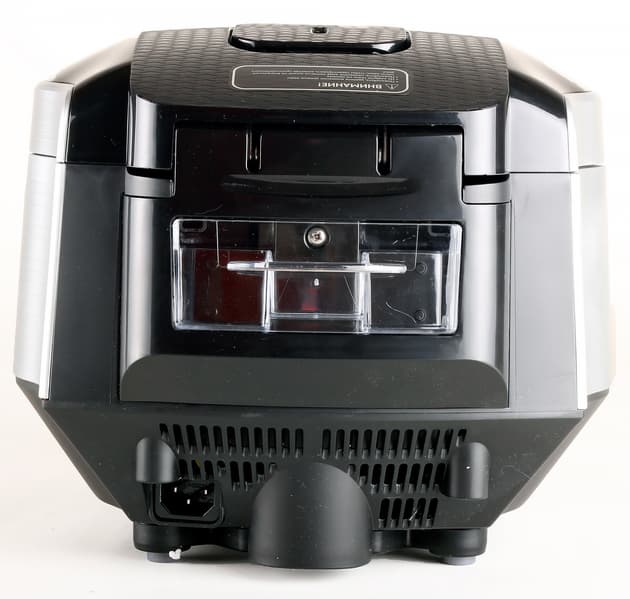 Снизу у мультиварки можно увидеть резиновые ножки (по совместительству выполняющие функцию датчиков веса), а также вентиляционное отверстие, выглядящее так, будто под ним прячется вентилятор (которого на самом деле нет).