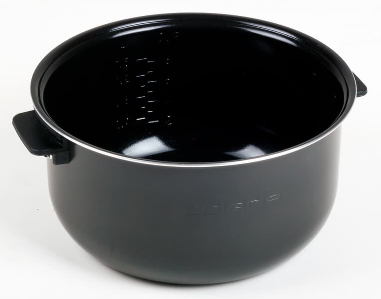 Чаша объемом 4 литра сделана из металлического сплава и покрыта антипригарным покрытием Anato. У чаши имеются ручки и градуировка на внутренней стороне (в литрах и чашках). Отметим, что градуировка нанесена с ошибкой: максимальный объем чаши согласно градуировке составляет 1,5 литра, что на самом деле соответствует 3 литрам. Именно таков оказался рабочий объем чаши.