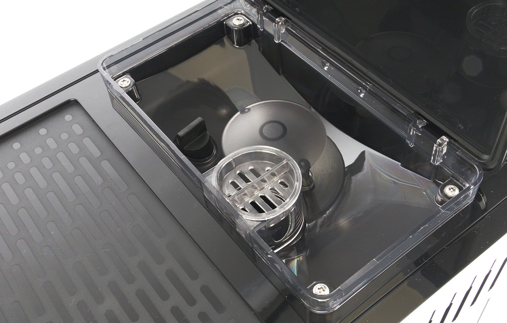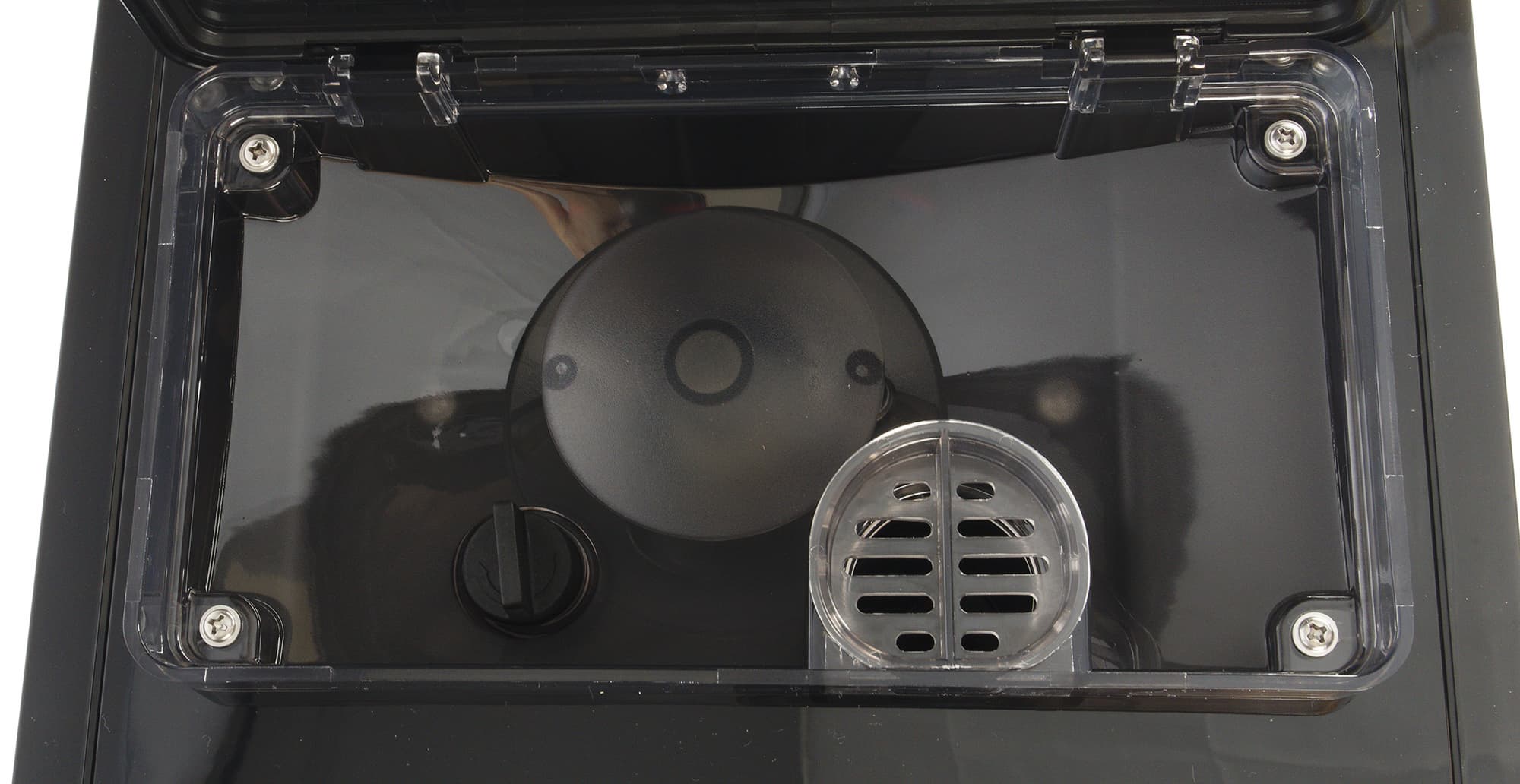 Над ними расположен съемный бак для воды. Бак прячется под откидной крышкой (она закреплена на корпусе устройства, а не на самом баке) и извлекается сверху-сзади. То есть, выбирая место для машины, нужно оставить достаточно места сверху, и немного сзади, иначе извлечь бак не получится. Пожалуй, единственный недостаток конструкции тут заключается в том, что крышка открывается на себя и в открытом положении держится не слишком уверенно. Одно неловкое движение — и она захлопнется. Все это означает, что если нам захочется долить воду, не извлекая бак, то делать это придется не спереди, а сбоку, за откидной крышкой. Не слишком удобно!