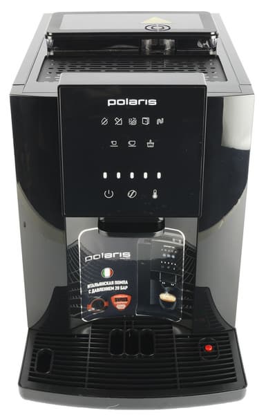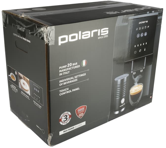 Кофемашина поставляется в объемной картонной коробке, оформленной в фирменном стиле Polaris. Печать на коробке полноцветная. Дизайн строгий: черный фон, небольшое количество ярких элементов, спереди — полноцветная фотография устройства. На боковых гранях находятся расширенная информация, а также перечислены основные характеристики устройства. Боковые ручки для переноски имеются, что немаловажно при таких габаритах и не самом маленьком весе.
