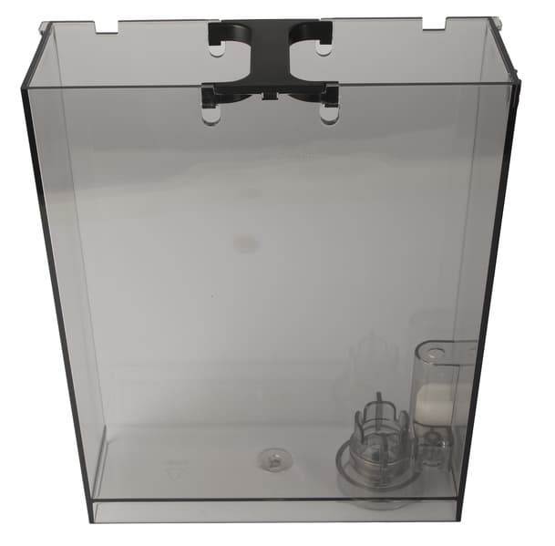 Сам бак объемом 1,6 литра сделан из затемненного прозрачного пластика. У бака предусмотрена ручка для переноски (и извлечения). Вода подается через клапан в нижней части. Там же виден поплавок, подающий машине сигнал о том, что вода заканчивается. В верхней части присутствует отметка максимального уровня заполнения контейнера.