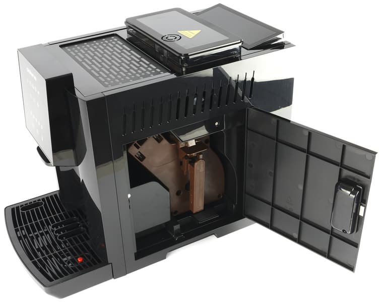Откроем боковой лючок. Он оснащен ручкой-защелкой и легко открывается, открывая доступ к заварочному блоку, контейнеру для отработанного кофе и поддону для молотого кофе, просыпавшегося в процессе приготовления.