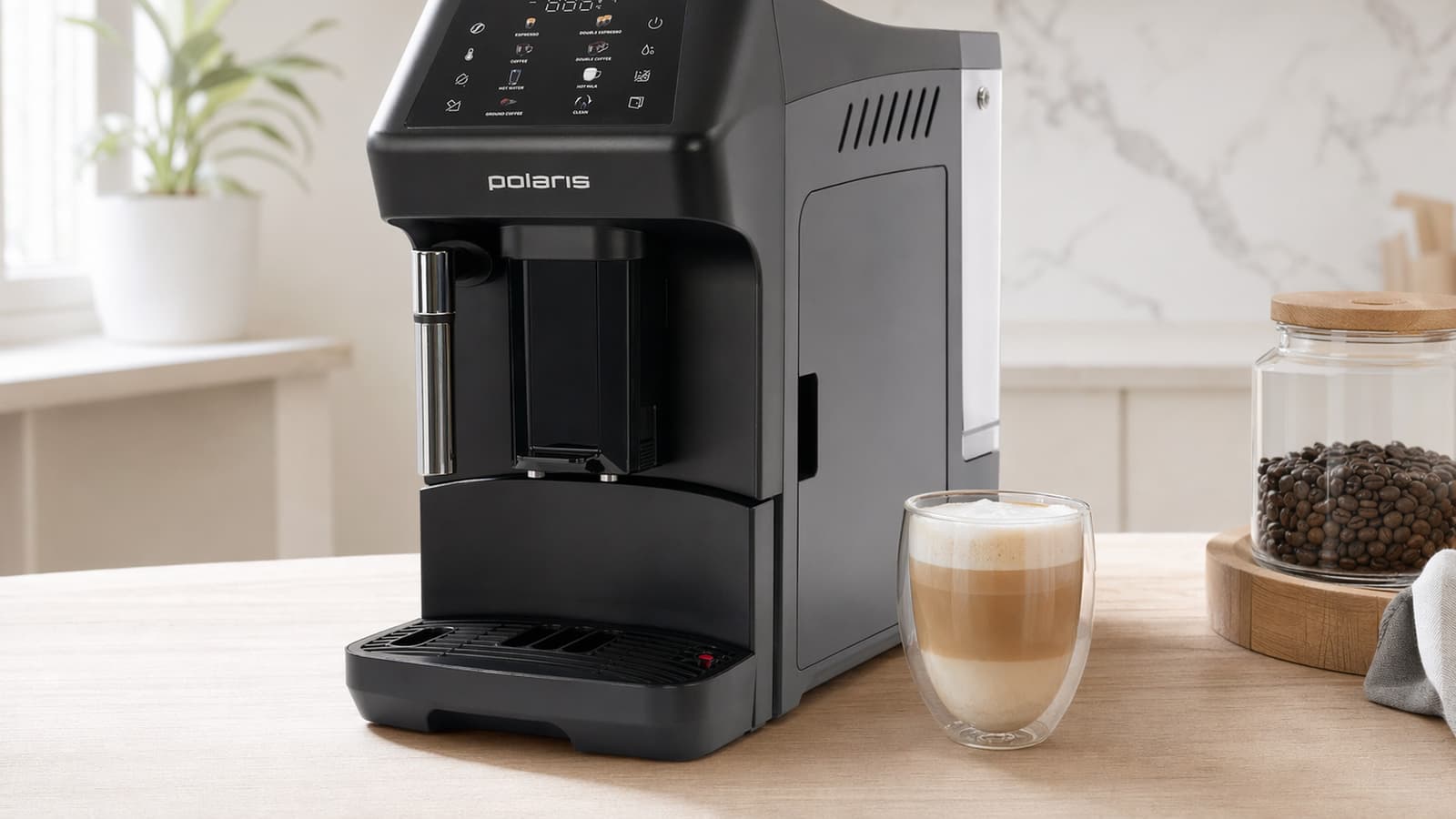 Герой нашего сегодняшнего обзора — кофемашина Polaris PACM 2048SW, способная приготовить кофе из зерна и оснащенная ручным (а не автоматическим) капучинатором, что автоматически переводит устройство в категорию «средних» или даже «бюджетных». Впрочем, розничная цена на момент подготовки составляет около 24 тысяч рублей. Выглядит вполне адекватно.