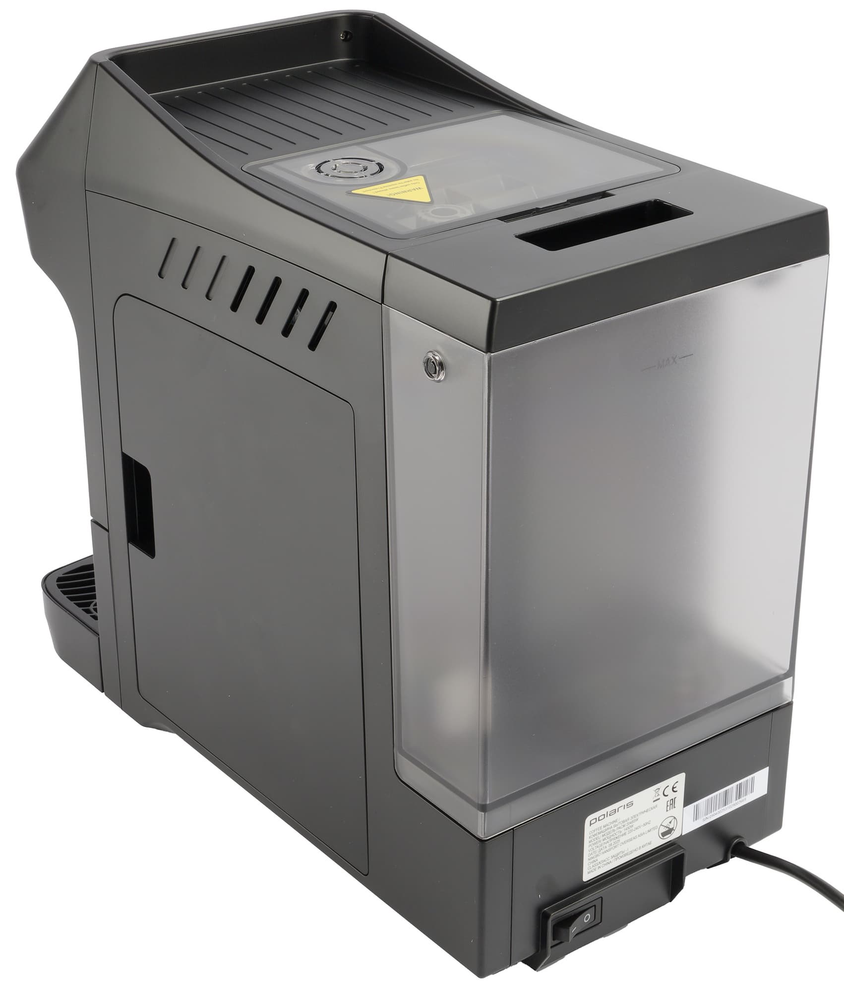 Кофемашина поставляется в картонной коробке, оформленной в традиционном дизайне Polaris. Печать на коробке полноцветная. Оформление строгое: фон темный. На нем выделяется небольшое количество ярких элементов. Спереди — полноцветная фотография устройства. На боковых гранях находятся расширенная информация, а также перечислены основные характеристики устройства. Боковые ручки для переноски предусмотрены, так что донести коробку до дома будет легко.
