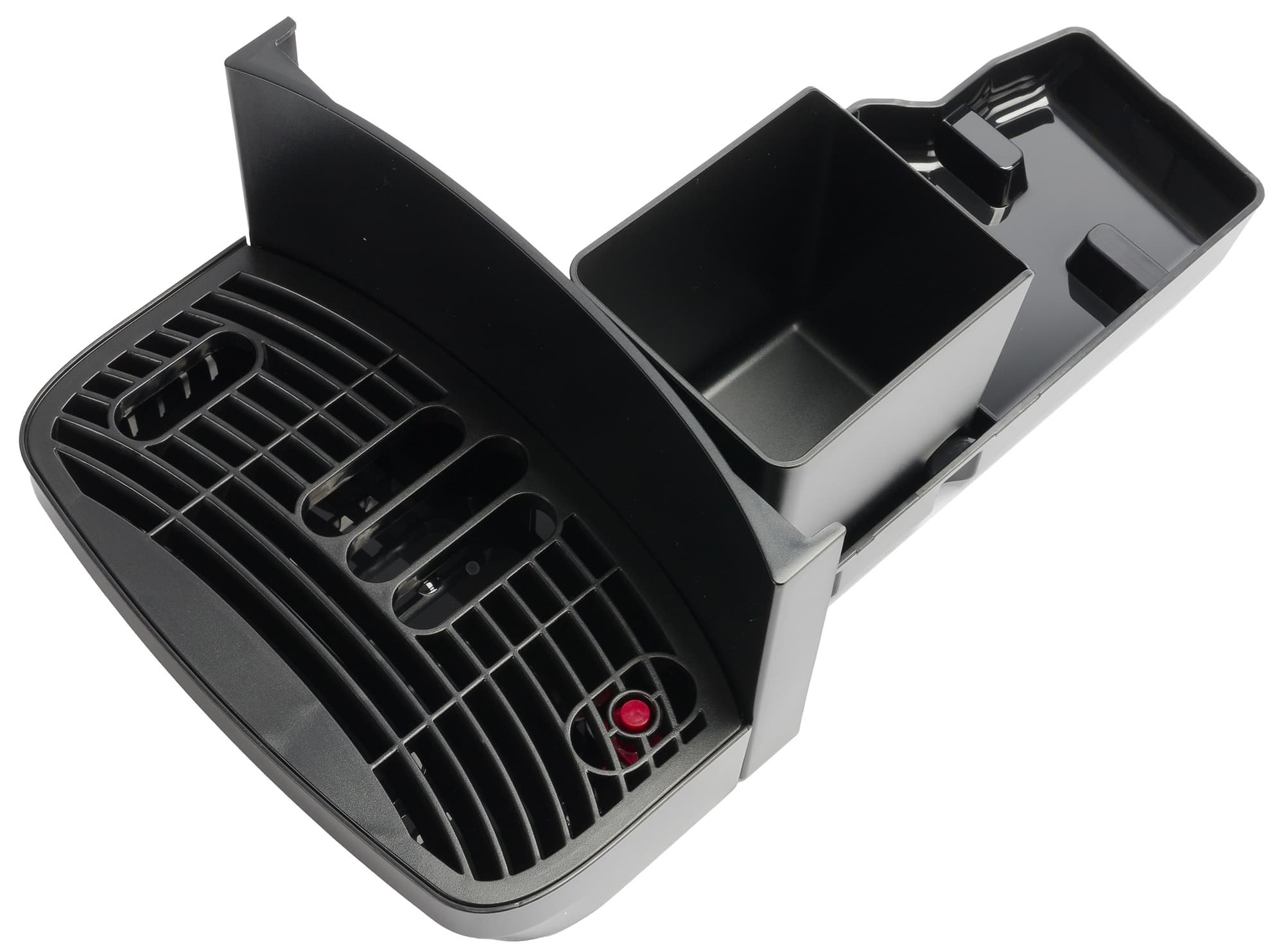 Под заварочным блоком предусмотрен небольшой пластиковый поддон, куда будут попадать остатки кофе, которые просыпались мимо (это совершенно нормально). Отсек для отработанных кофейных зерен расположен спереди, вместе с поддоном для сборка капель, поэтому в отсек с заварочным блоком мы будем заглядывать не слишком часто.