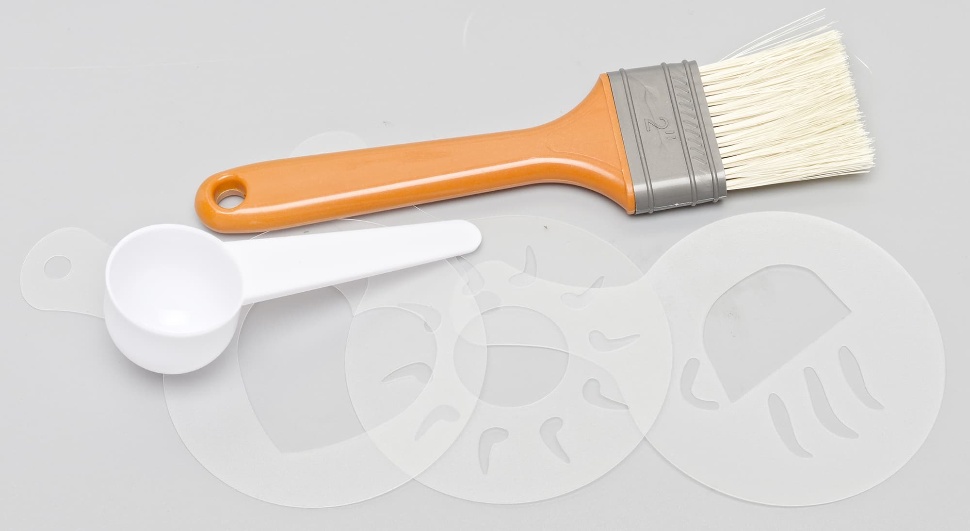 Дополнительные аксессуары (мерная ложка, щетка для очистки и трафареты для латте-арта) совершенно обычные и интереса не представляют.